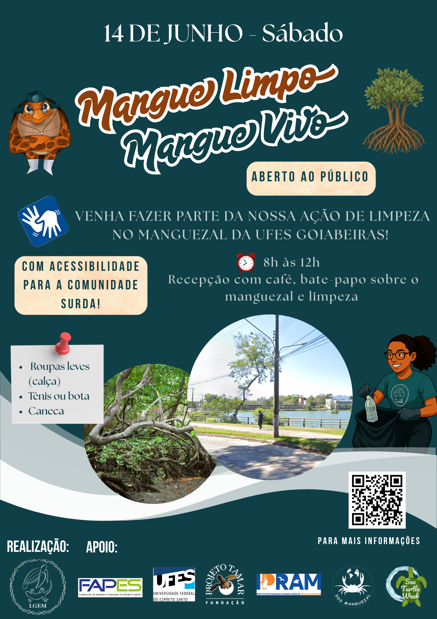 O Laboratório de Genética e Evolução Molecular (LGEM), vinculado ao Departamento de Ciências Biológicas da Ufes, promove neste sábado, 14, das 8 às 12 horas, a ação de limpeza e conscientização ambiental Mangue Limpo, Mangue Vivo, no manguezal localizado no campus da Ufes em Goiabeiras. O evento é gratuito, aberto ao público, e contará com acessibilidade em Libras, garantindo a participação da comunidade surda. O ponto de encontro será na lagoa da Universidade.