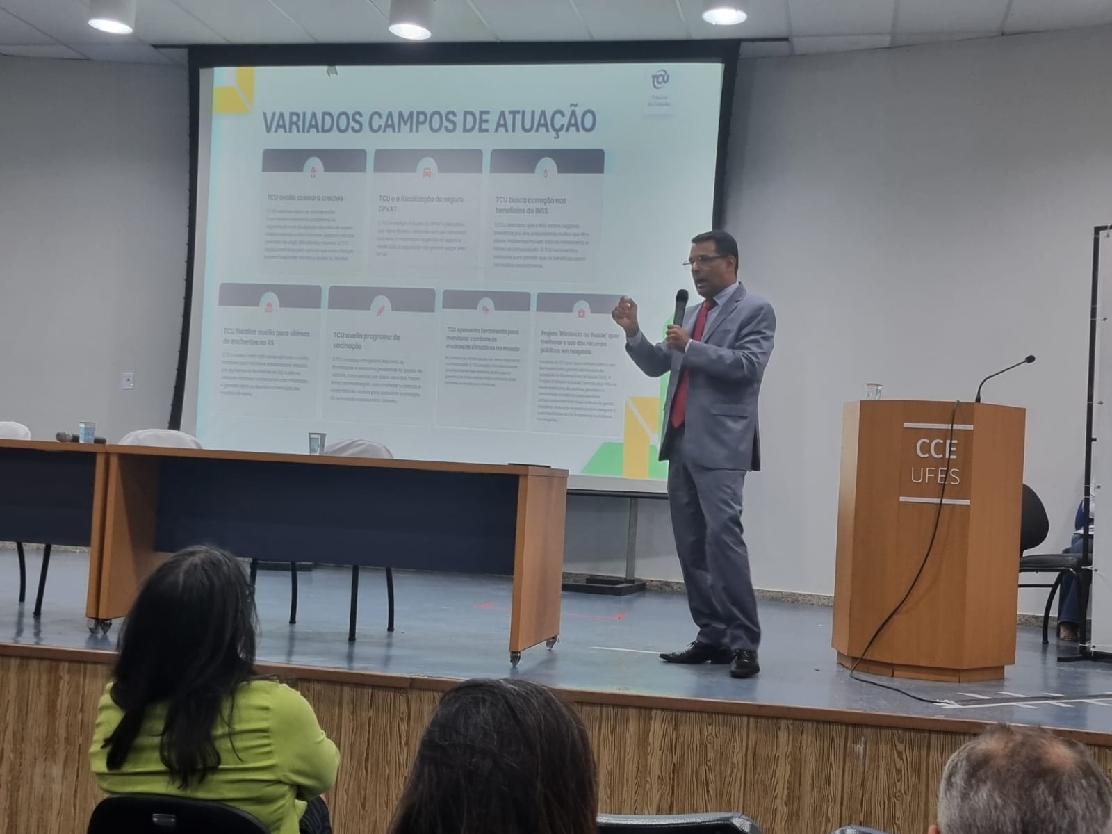 A palestra magna foi proferida pelo secretário do Tribunal de Contas da União no Espírito Santo (TCU-ES), Leonardo Ferreira, que falou sobre as funções do TCU, enfatizando três delas: práticas de consensualismo, que consiste na negociação consensual entre as partes interessadas na busca de uma solução; estímulo ao exercício da cidadania; e capacitação dos entes da administração pública para a aplicação da nova lei de licitações.