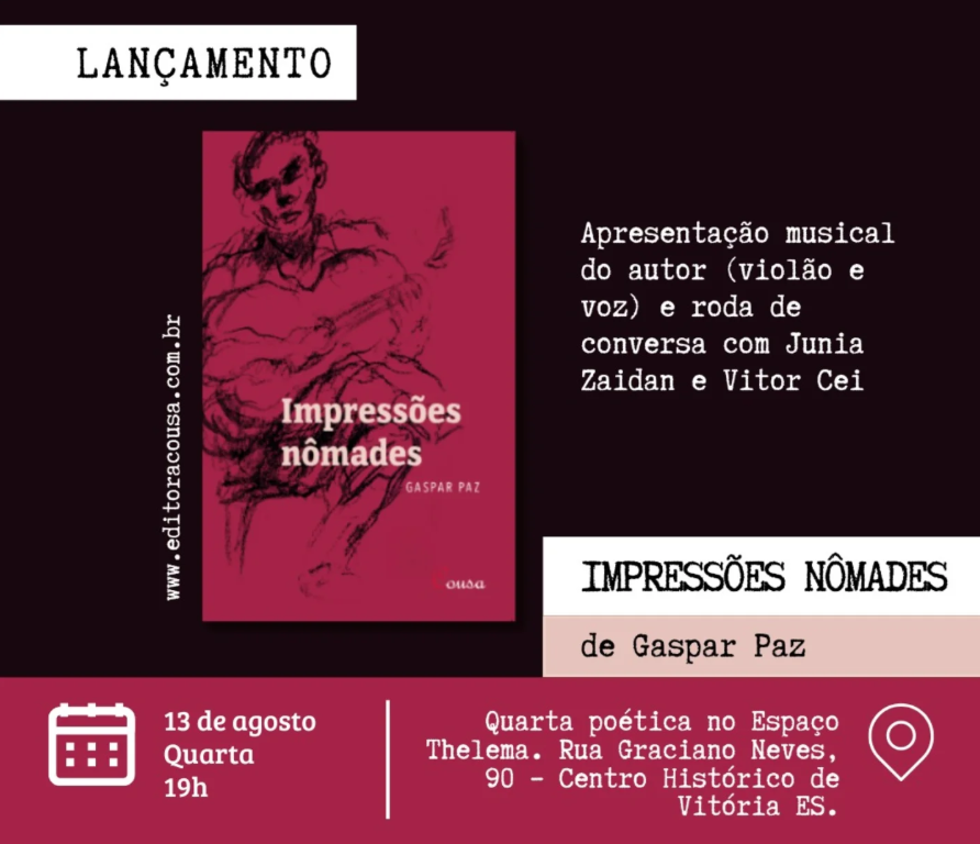 Professor do Programa de Pós-Graduação em Letras (PPGL), Paz lançará o livro autoral Impressões Nômades às 19 horas, no Espaço Thelena, localizado no Centro de Vitória. Esta é a primeira obra de escritos literários do professor, que revela traços de um itinerário em formação a partir da descoberta da cidade do Rio de Janeiro (onde morou por quase 15 anos, enquanto fazia mestrado e doutorado). Impressões Nômades reúne escritos sobre artes plásticas, fotografia, cinema, música e poesia, que surgiram em decorrência de preocupações sociais e políticas, e destaca seu olhar estético-político em poemas escritos sobre a cidade de Vitória.