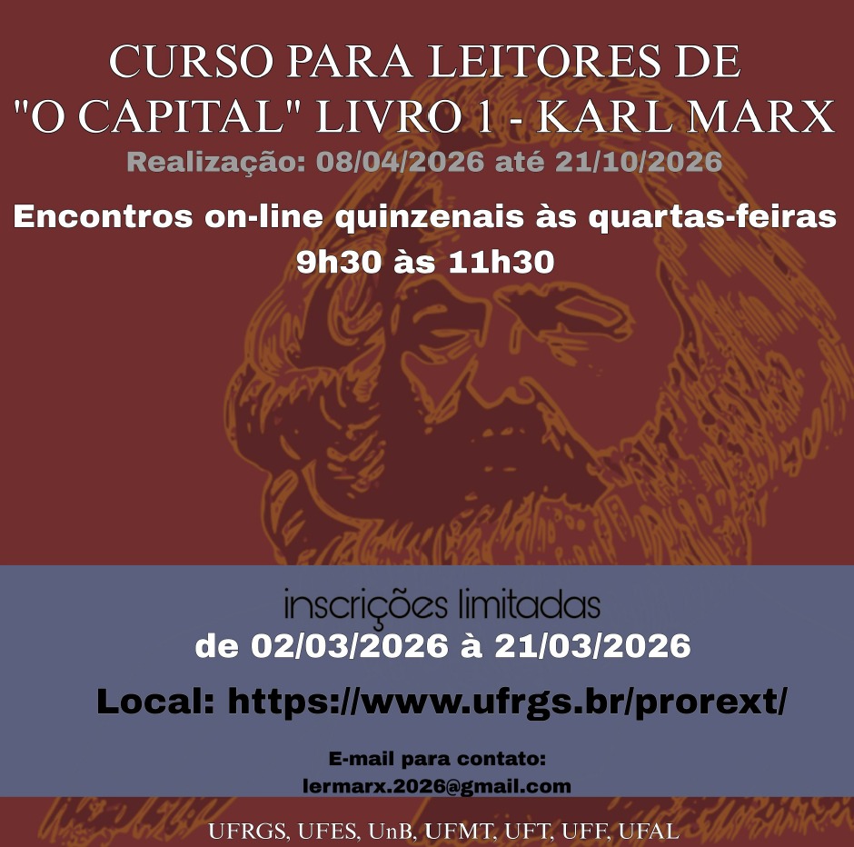 Até o próximo dia 21, pessoas interessadas na obra O Capital, de Karl Marx, podem se inscrever no curso de extensão gratuito Leitores/as de O Capital – Livro I, ofertado no âmbito de uma ação interinstitucional de estudos sistemáticos do livro. Na Ufes, a iniciativa se desenvolve por meio do projeto de extensão Processo Global de Produção do Capital e Luta de Classes, que integra essa rede ampliada de universidades públicas brasileiras. As inscrições devem ser realizadas no site da Universidade Federal do Rio Grande do Sul (UFRGS).