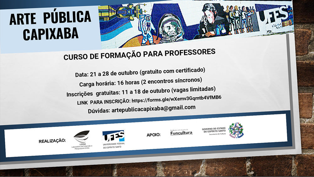 O Grupo de Estudos sobre Arte Pública Capixaba (Leena) está ofertando vagas de formação destinadas a professores da educação básica no curso on-line Arte Pública Capixaba. As inscrições seguem abertas até 18 de outubro e tem como público-alvo educadores que trabalham do ensino infantil até o médio.