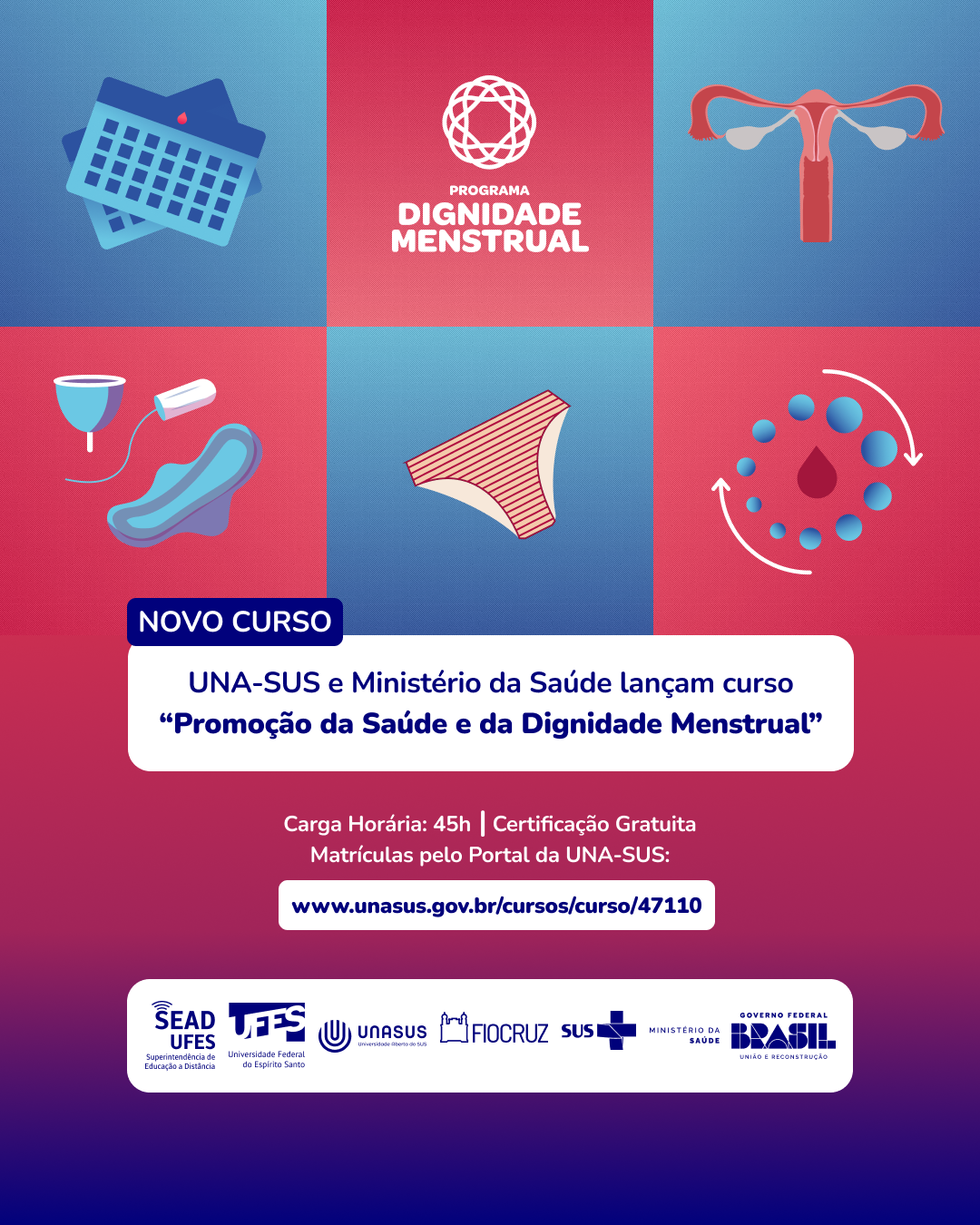 Podem se matricular, por meio deste link, profissionais da saúde, da educação, gestoras e gestores, estudantes, lideranças comunitárias e todas as pessoas interessadas na temática. Com carga horária de 45 horas, o curso é gratuito e integra as ações do Programa de Promoção e Proteção da Saúde e da Dignidade Menstrual, que assegura a oferta gratuita de absorventes por meio do Programa Farmácia Popular do Brasil e desenvolve ações de educação em saúde menstrual para agentes públicos, profissionais de saúde e a população em geral, com o compromisso de enfrentar estigmas, combater a desinformação e afirmar a dignidade como política pública.