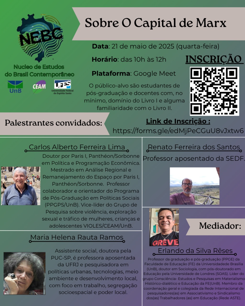 Segundo a coordenadora do Nevi, Raquel Sabará, o Núcleo de Estudos da Ufes e o NEBC, da UnB, promovem, desde 2019, a leitura sistemática de O Capital, de Karl Marx, com o objetivo de refletir criticamente sobre o processo global de produção capitalista e suas formas contemporâneas, com foco na luta de classes e na apropriação do valor socialmente produzido no primeiro quartil do século XXI. “Esse projeto tem sido importante para qualificar docentes no método da crítica da economia política, para aplicação em suas práticas acadêmicas, promovendo uma troca intergeracional de saberes entre professores do magistério superior, aposentados e em exercício, e a comunidade acadêmica”, explica.