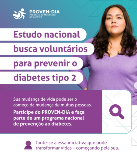O Programa de Prevenção do Diabetes tipo 2 (Proven Dia) está com 12 vagas abertas para que pessoas acima de 18 anos, que tenham diagnóstico de pré-diabetes e tenham acesso à internet, façam acompanhamento gratuito. Os atendimentos serão agendados previamente e realizados por uma equipe multidisciplinar, composta por pesquisadores e profissionais da saúde, como médicos, nutricionistas e enfermeiros. Clique aqui e preencha o formulário de cadastro.