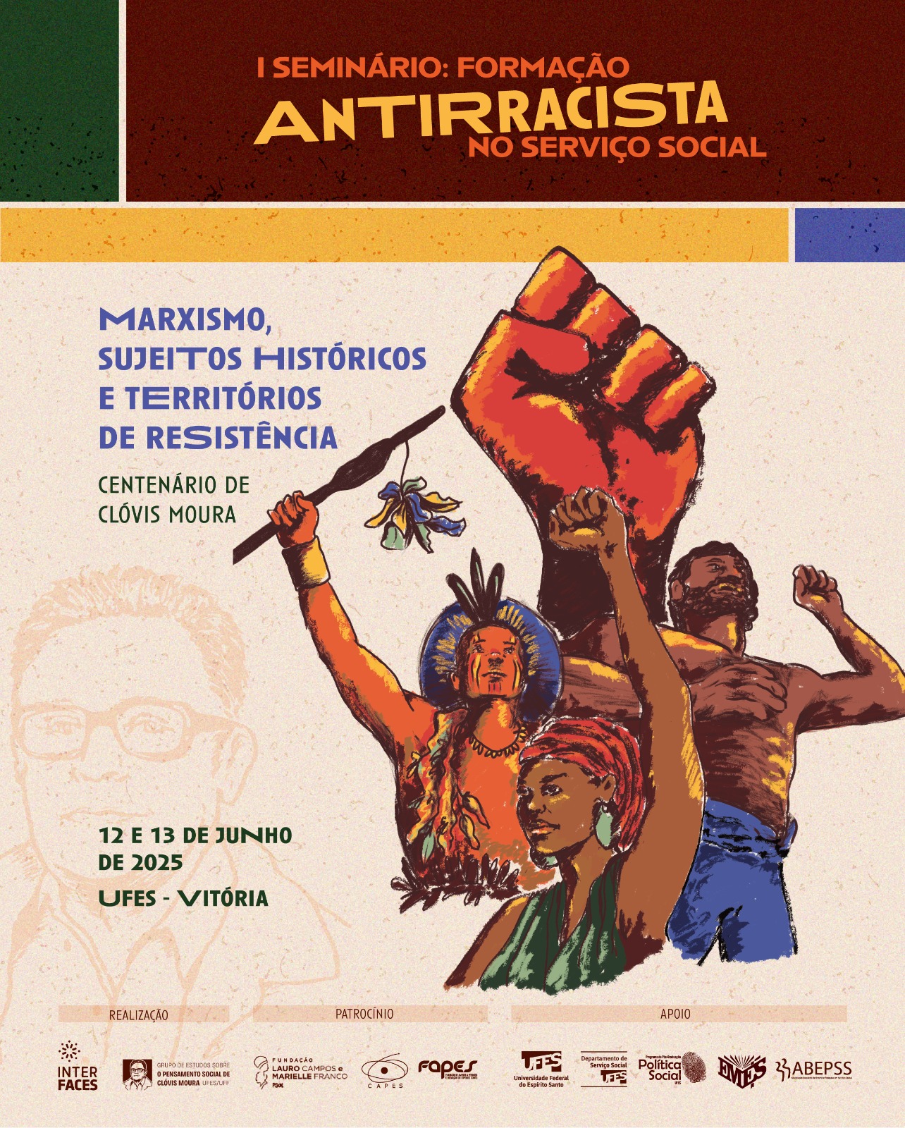 O Grupo de Estudos Interfaces da Ufes e o Grupo de Estudos sobre o Pensamento Social de Clóvis Moura (formado por membros da Ufes e Universidade Federal Fluminense) realizam nesta quinta e sexta-feira, dias 12 e 13, o I Seminário Formação Antirracista no Serviço Social: Marxismo, Sujeitos Históricos e Territórios de Resistência – Centenário Clóvis Moura. O evento será no Centro de Ciências Jurídicas e Econômicas (CCJE), campus de Goiabeiras.