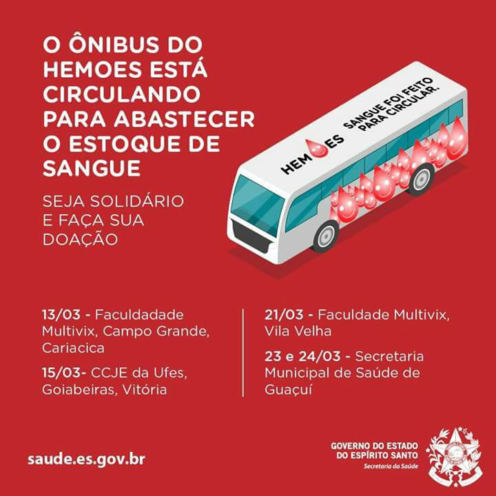 Um ônibus do Hemocentro do Estado do Espírito Santo (Hemoes) estará estacionado próximo à cantina do Centro de Ciências Jurídicas e Econômicas (CCJE), no campus de Goiabeiras, na manhã desta quinta-feira, 15. A ação faz parte da Recepção do Bem, ação solidária idealizada por estudantes do segundo período do curso de Ciências Econômicas da Ufes, que promoverá uma campanha de doação de sangue.