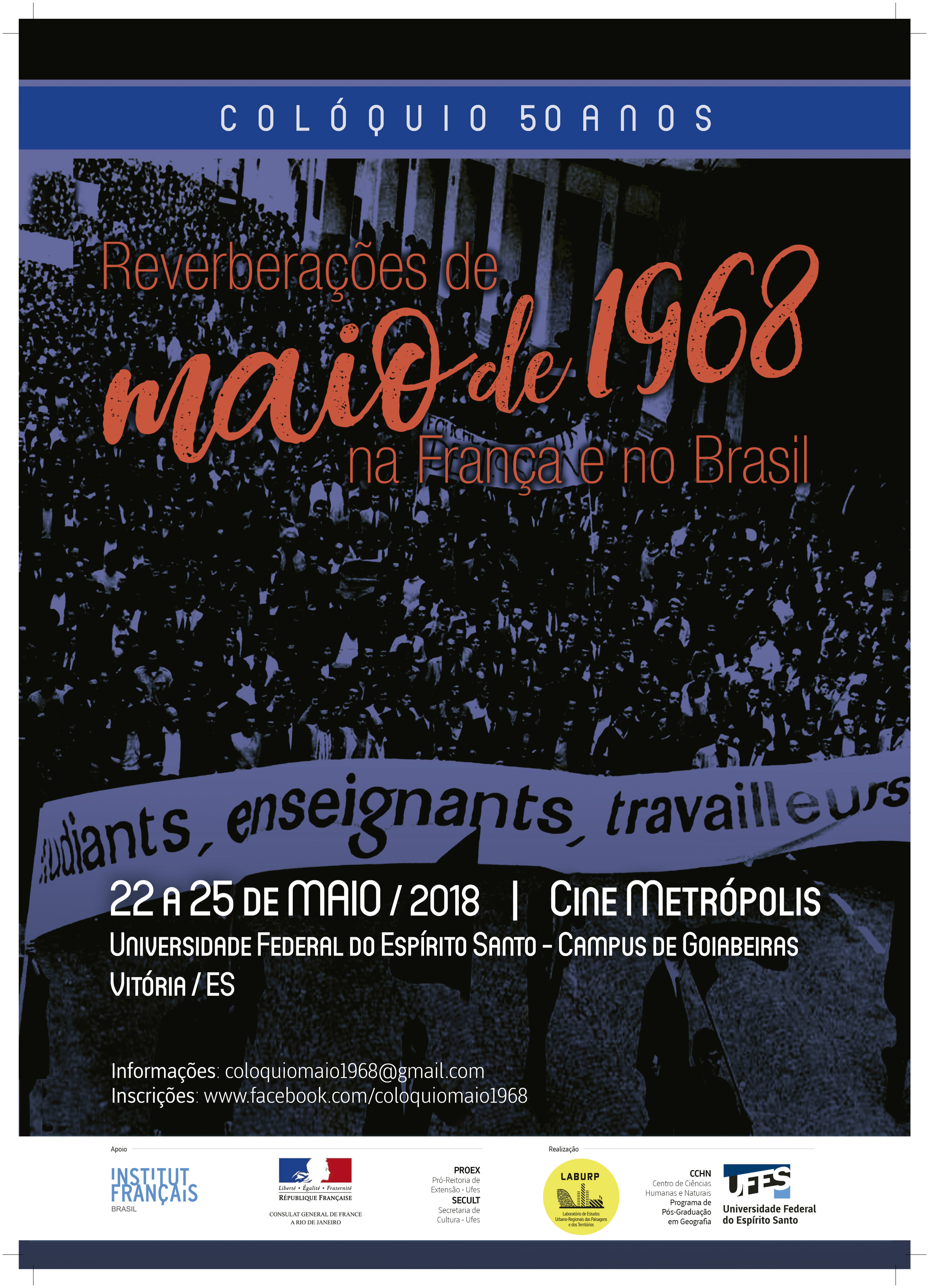 A partir desta terça-feira, 22, começa na Ufes o Colóquio 50 anos – Reverberações de maio de 1968 na França e no Brasil. O evento, a ser realizado até o dia 25 de maio no Cine Metrópolis, tem o objetivo de celebrar, refletir e debater os acontecimentos históricos ocorridos em maio de 1968 na Europa e no Brasil, marcados por intensas mobilizações populares, em especial por manifestações estudantis que reivindicavam melhorias na educação.