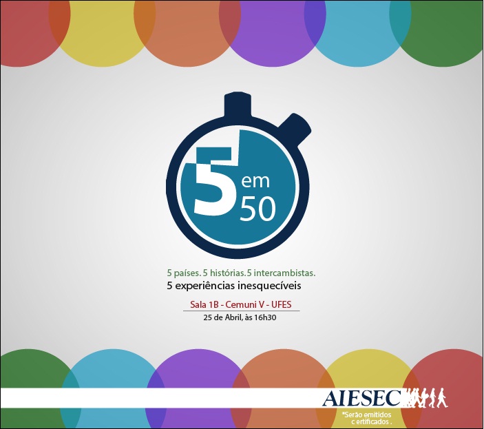 A Aiesec Vitória, entidade com sede na Ufes, promove na sexta-feira, dia 25, a palestra “5 em 50”, na qual cinco estudantes que participaram de um intercâmbio internacional contam suas experiências num encontro com duração de 50 minutos. O evento vai acontecer às 16h30, no prédio do Cemuni V, no campus Goiabeiras, e é aberto a toda a comunidade universitária e ao público em geral.