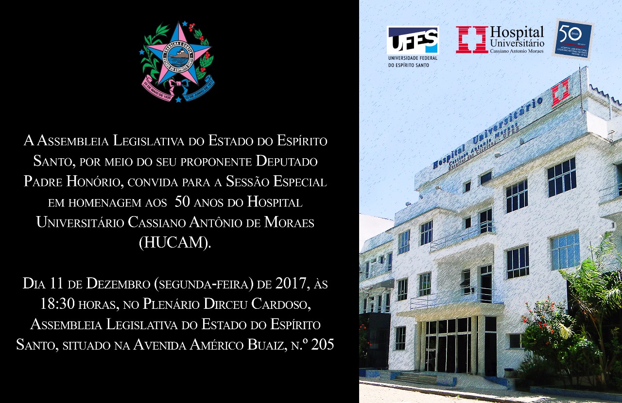 A Assembleia Legislativa do Espírito Santo realiza nesta segunda-feira, 11, às 18h30, sessão especial em homenagem aos 50 anos do Hospital Universitário Cassiano Antonio Moraes (Hucam). A sessão, proposta pelo deputado Padre Honório, será realizada no plenário Dirceu Cardoso e contará com a presença do reitor da Ufes Reinaldo Centoducatte, da vice-reitora Ethel Maciel, e do superintendente do Hucam, Luiz Alberto Sobral Vieira Júnior.