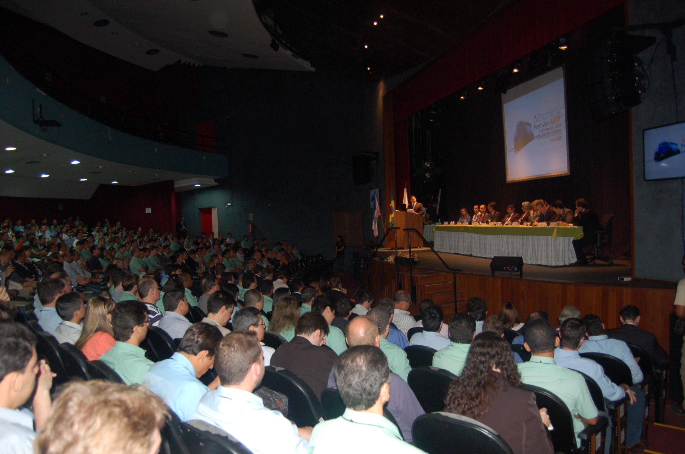 Autoridades, funcionários e empresários do setor ferroviário lotaram o Teatro Universitário na manhã desta quinta-feira, 8 de agosto, para a abertura do IV Encontro de Ferrovias. Sediado na Ufes, o evento é promovido pela Associação Nacional dos Transportes Ferroviários (ANTF), com o tema “Produtividade do sistema ferroviário e a segurança operacional” e vai até o dia 8, com palestras e apresentações de trabalhos.