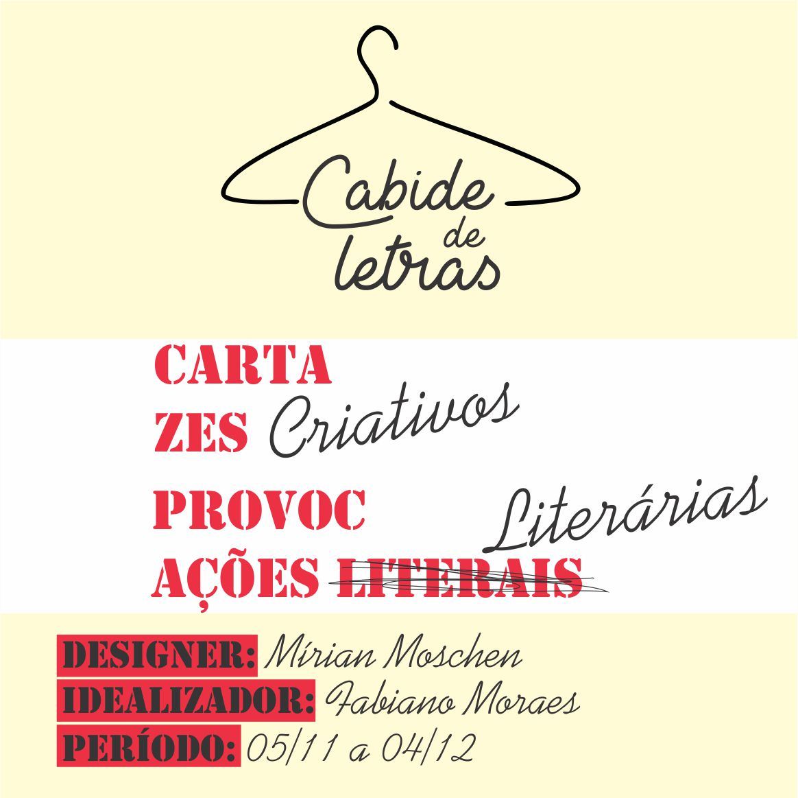 O projeto Cabide de Letras, idealizado pelo escritor Fabiano Moraes, reúne cartazes com elementos textuais e imagéticos. Os textos são compostos por trechos de obras literárias ou por reflexões como “o que te impede de voar?” e “você já se acostumou ou ainda sonha?”. São peças irônicas, críticas, provocativas, populares e literárias, que utilizam cabides como suportes – item que tem relação direta com a experiência de Mírian, que tem formação em Design de Moda.