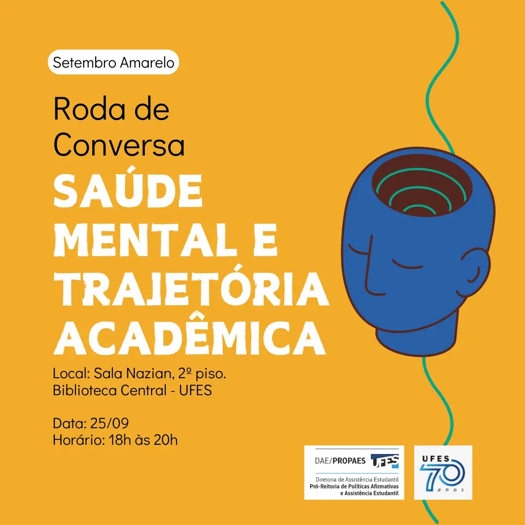A Biblioteca Central da Ufes (BC) recebe, nesta quarta-feira, 25, a roda de conversa Saúde mental e trajetória acadêmica, com mediação do psicólogo Gabriel Monteiro e da assistente social Francielly Nascimento. O evento acontece a partir das 18 horas na Sala Naziam, no 2º andar da BC, e é aberto ao público. Haverá emissão de certificados para os participantes, que poderão se inscrever no local do encontro.