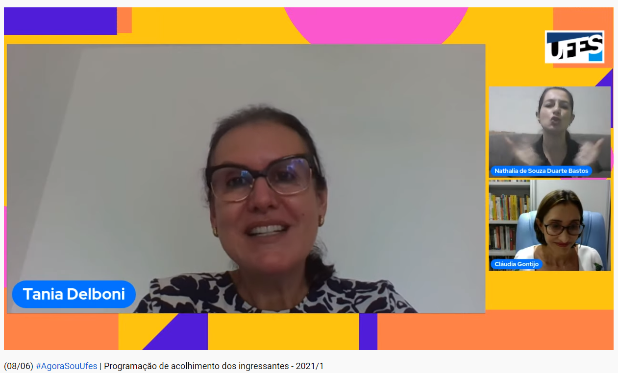 Os novos estudantes da Ufes foram recepcionados pela Administração Central em reunião virtual realizada na manhã desta terça-feira, 8, e transmitida pelo canal Ufes Oficial no YouTube. O primeiro dia do evento de acolhimento aos ingressantes no semestre letivo 2021/1 foi de boas-vindas, apresentação das pró-reitorias, além da aula inaugural. Clique aqui para assistir.
