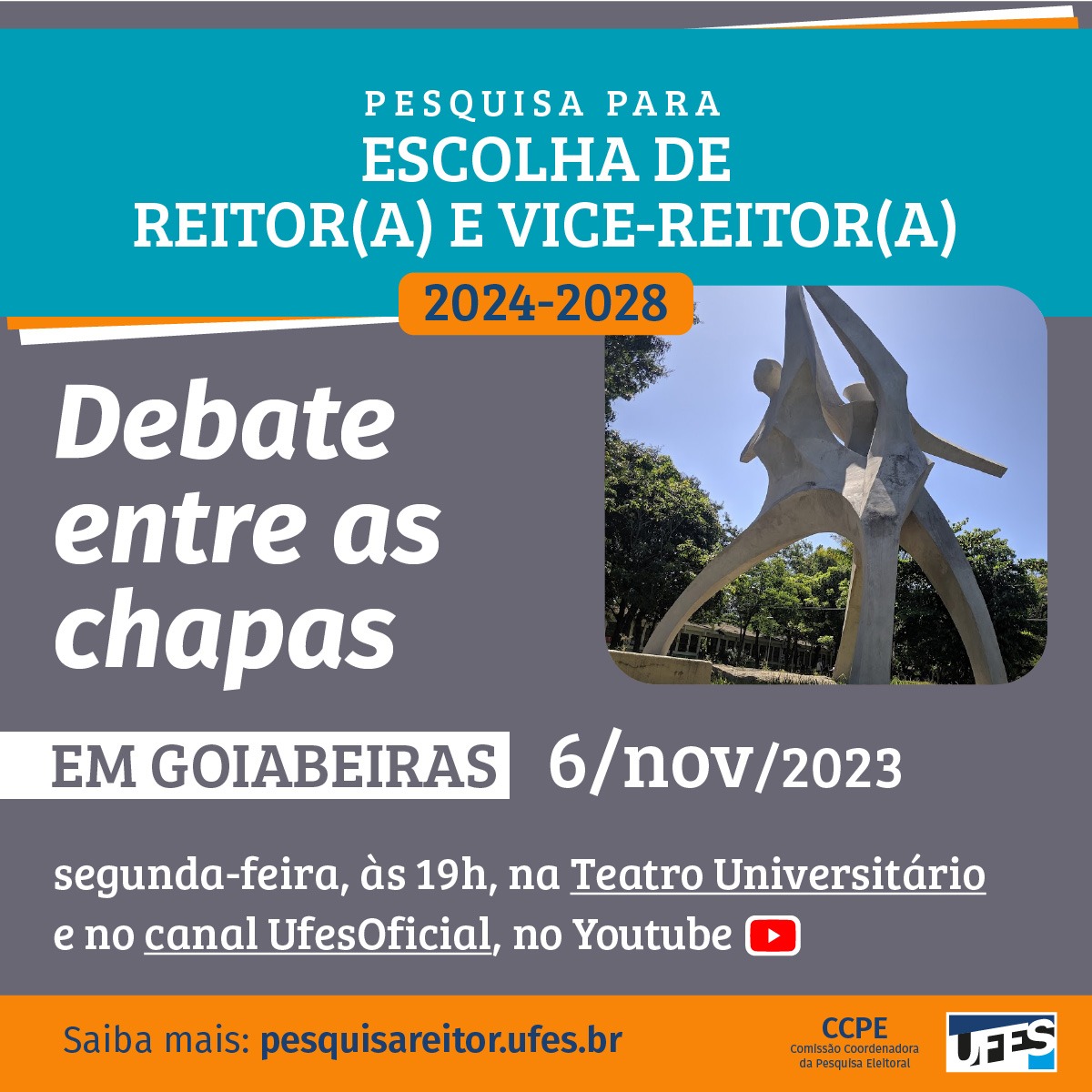 A série de debates é promovida pela Comissão Coordenadora da Pesquisa Eleitoral (CCPE), cumprindo o calendário aprovado em sessão conjunta dos três conselhos superiores da Universidade. Participarão do debate a professora do Departamento de Psicologia Social e do Desenvolvimento e diretora do Centro de Ciências Humanas e Naturais (CCHN), Edinete Maria Rosa, candidata a reitora da chapa 20; e o professor do Departamento de Química e vice-diretor do Centro de Ciências Exatas (CCE), Eustáquio Vinicius Ribeiro de Castro, candidato a reitor da chapa 10.
