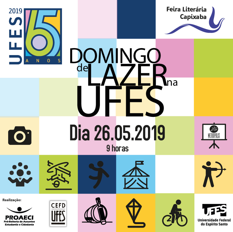 A Ufes realiza neste domingo, 26, das 9 às 12 horas, o Domingo de Lazer na Ufes – especial de aniversário, no campus de Goiabeiras. Serão diversas atividades esportivas e culturais, gratuitas e abertas ao público, que farão parte da programação em homenagem ao aniversário de 65 anos da Universidade, celebrado neste mês de maio.
