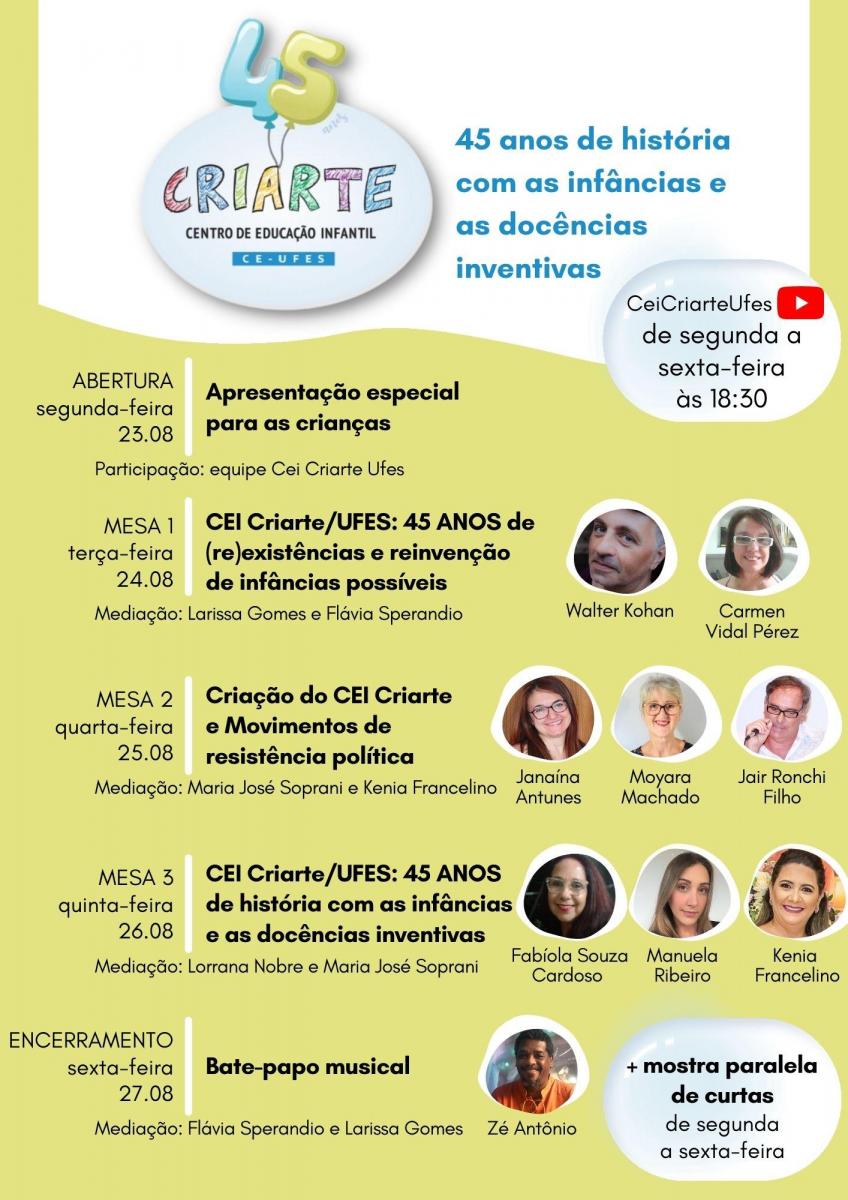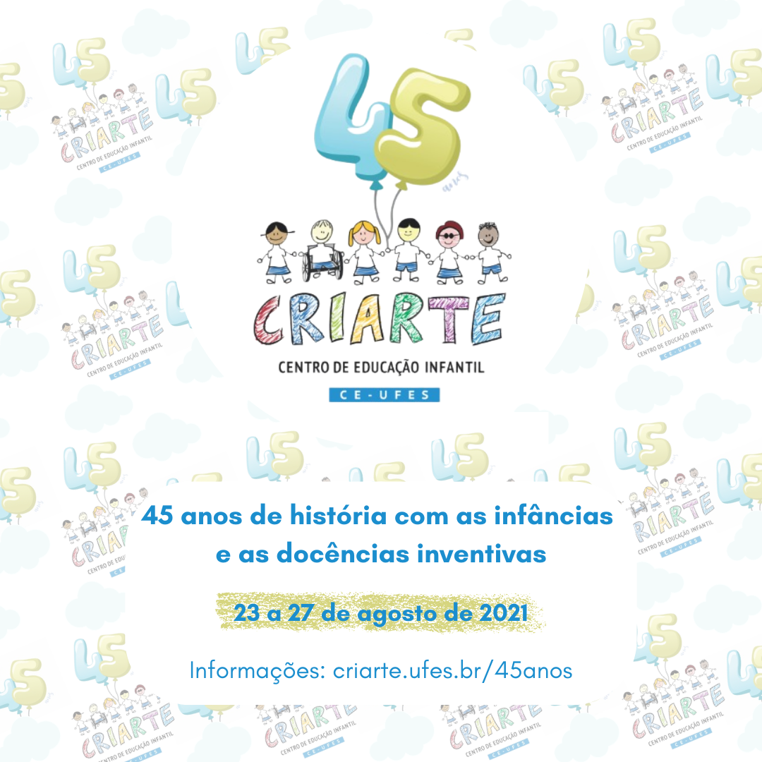Para celebrar os seus 45 anos de existência, o Centro de Educação Infantil (CEI) Criarte realiza, de 23 a 27 de agosto, o Seminário 45 anos de história com as infâncias e as docências inventivas, comemorando uma trajetória de luta pelos direitos sociais e educacionais das crianças. O evento será on-line, e todas as transmissões serão feitas pelo canal do Criarte/Ufes no YouTube, a partir das 18h30. Estudantes de licenciatura, pesquisadores e profissionais da educação em geral, assim como todos os interessados nesse campo do conhecimento, podem se inscrever, até o primeiro dia do evento, por meio do formulário on-line disponibilizado em https://criarte.ufes.br/. Para ter direito à certificação de 12 horas emitida pela Pró-Reitoria de Extensão (Proex), será necessária frequência mínima de 75%, registrada em lista de presença durante o evento.