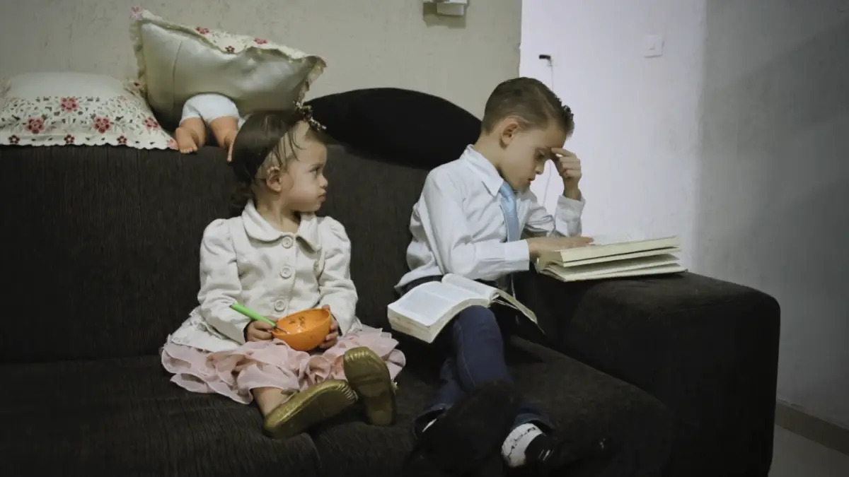 Cena de A Voz de Deus, na qual aparecem um menino sentado no sofá, lendo um livro. Ao seu lado, sua irmã o observa