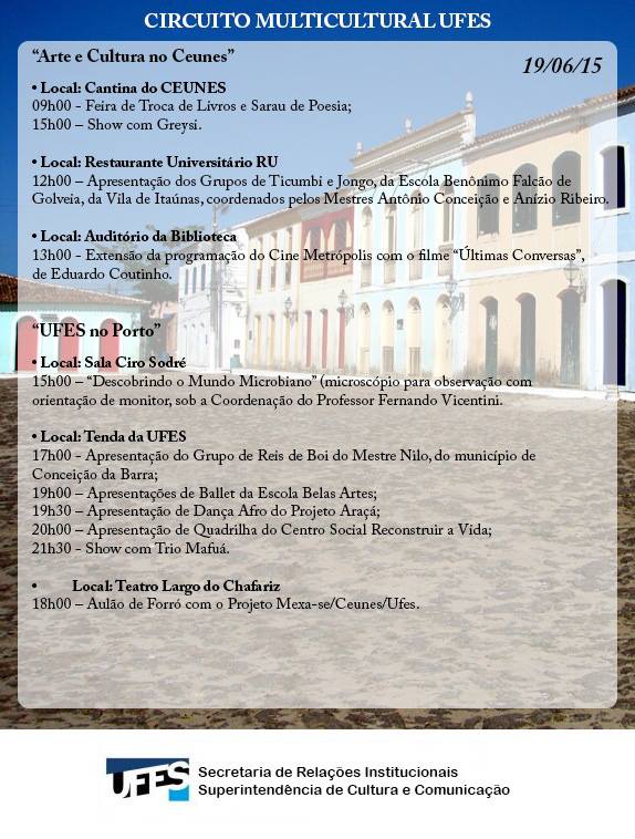 Encerrando as atividades culturais do semestre letivo 2015/1 do campus de São Mateus acontece nesta sexta-feira (19) mais uma edição dos eventos “Arte e Cultura no Ceunes” e “Ufes no Porto de São Mateus”. Os encontros fazem parte do projeto Circuito Multicultural da Ufes, que é realizado pela Superintendência de Cultura e Comunicação da universidade e pelo Centro Universitário Norte do Espírito Santo (Ceunes), com o apoio do Ministério da Cultura.