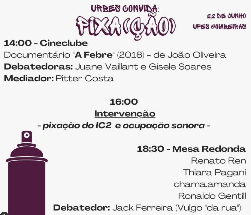 O evento terá início às 14 horas, no Cine Metrópolis, com a exibição do documentário A Febre, de João Oliveira. O filme acompanha a cena de grafiteiros e pixadores no Espírito Santo, por meio de depoimentos e imagens dos artistas retratados. Após a sessão, haverá debate com a produtora Juane Vaillant e a pesquisadora Gisele Soares, mediado por Pitter Costa.