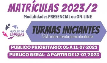 A partir desta quarta-feira, 5, estarão abertas as matrículas para turmas iniciantes nos cursos ofertados pelo Núcleo de Línguas da Ufes, nas modalidades presencial e on-line. Até o dia 11 de julho, a matrícula é prioritária para estudantes matriculados na rede pública de ensino. A partir do dia 12, as vagas remanescentes serão destinadas à comunidade geral.