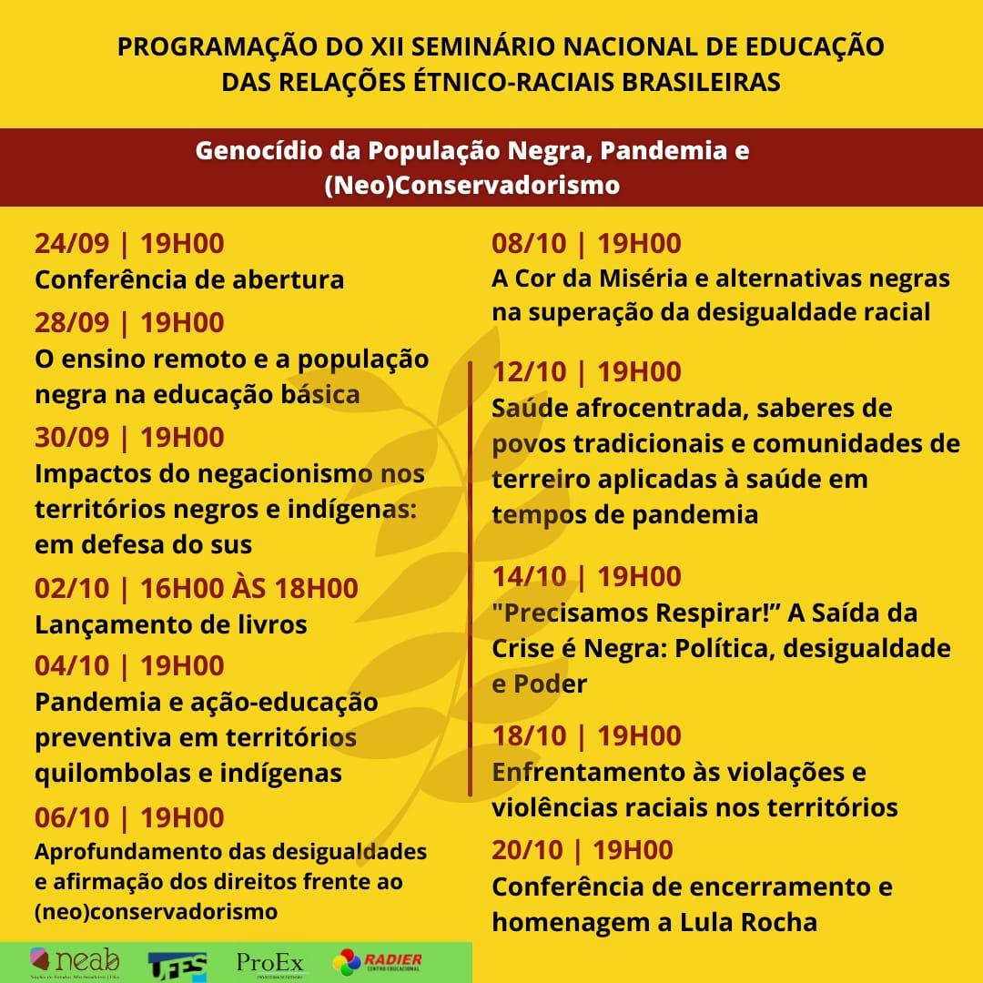 Com o tema Genocídio da população negra, pandemia e (neo)conservadorismo, o XII Seminário de Educação das Relações Étnico-Raciais começa nesta sexta-feira, 24, de forma remota, transmitindo 11 palestras até o dia 20 de outubro. O evento será promovido pelo Núcleo de Estudos Afro-Brasileiros (Neab), que fará a transmissão por meio de seu canal no YouTube, das 19 às 21 horas.