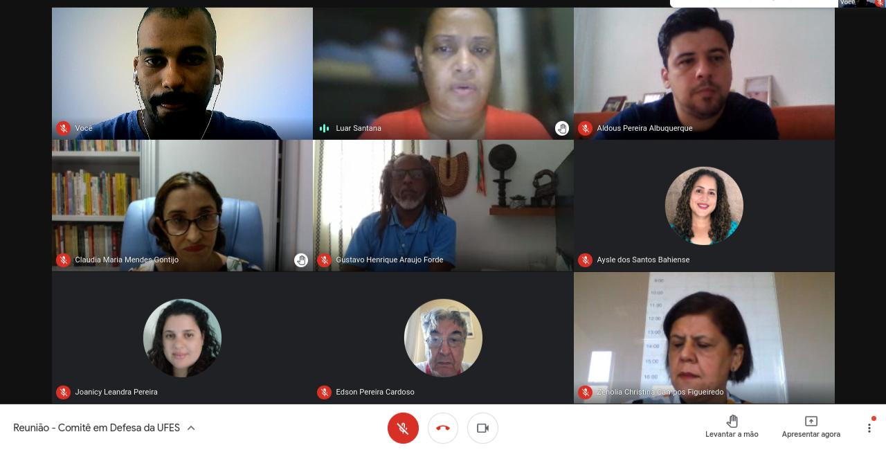 Foi realizada na manhã desta quinta-feira, 27, a primeira reunião (foto) da nova composição do Comitê em Defesa da Universidade Federal do Espírito Santo, formado por representantes da Associação dos Docentes da Ufes (Adufes), do Sindicato dos Trabalhadores da Ufes (Sintufes), do Diretório Central dos Estudantes (DCE) e da Administração Central. O Comitê, que já havia atuado em 2019 contra os cortes orçamentários realizados pelo governo federal naquele ano, foi reinstalado e tem o objetivo de refletir e propor ações conjuntas em defesa da instituição e da educação superior pública, gratuita e de qualidade.