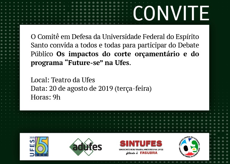 O Comitê em Defesa da Universidade Federal do Espírito Santo realiza, no dia 20 de agosto, o debate público Os impactos do corte orçamentário e do programa “Future-se” na Ufes. O evento é aberto ao público e será realizado a partir das 9 horas no Teatro Universitário, campus de Goiabeiras.