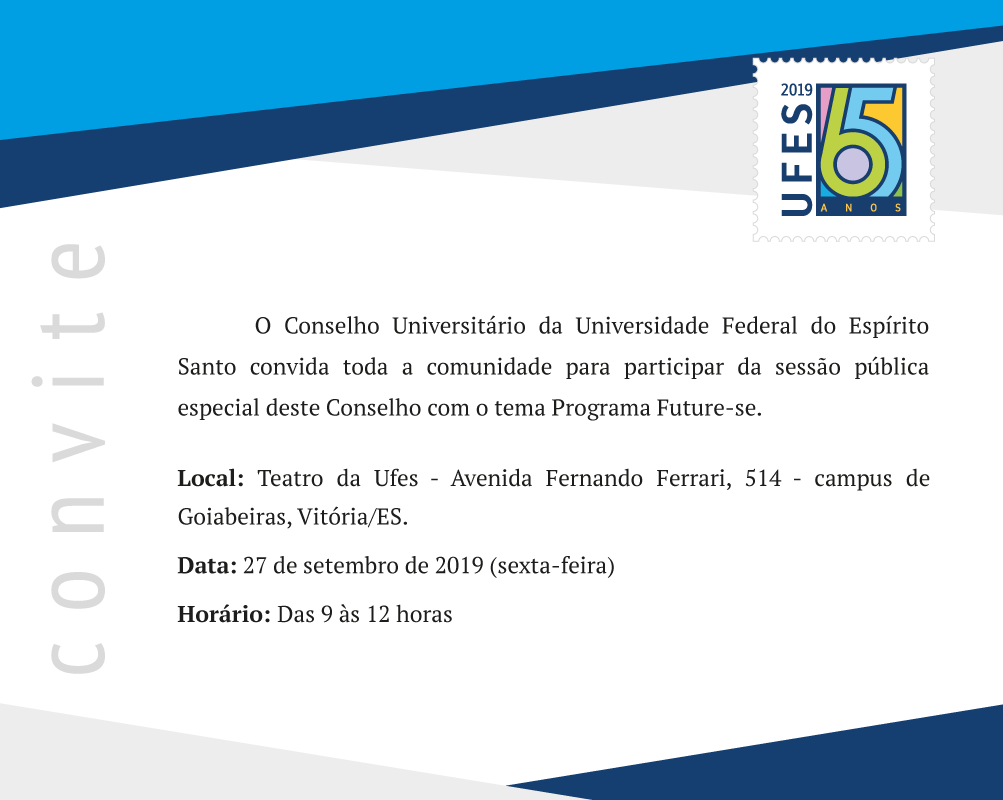 O Conselho Universitário da Ufes realiza nesta sexta-feira, 27, das 9 às 12 horas, uma sessão pública especial para debater o Programa Future-se. O evento é aberto à participação dos membros da comunidade universitária – estudantes, servidores técnicos e docentes – e será realizado no Teatro Universitário, campus de Goiabeiras, com transmissão para os campi de Alegre e São Mateus.