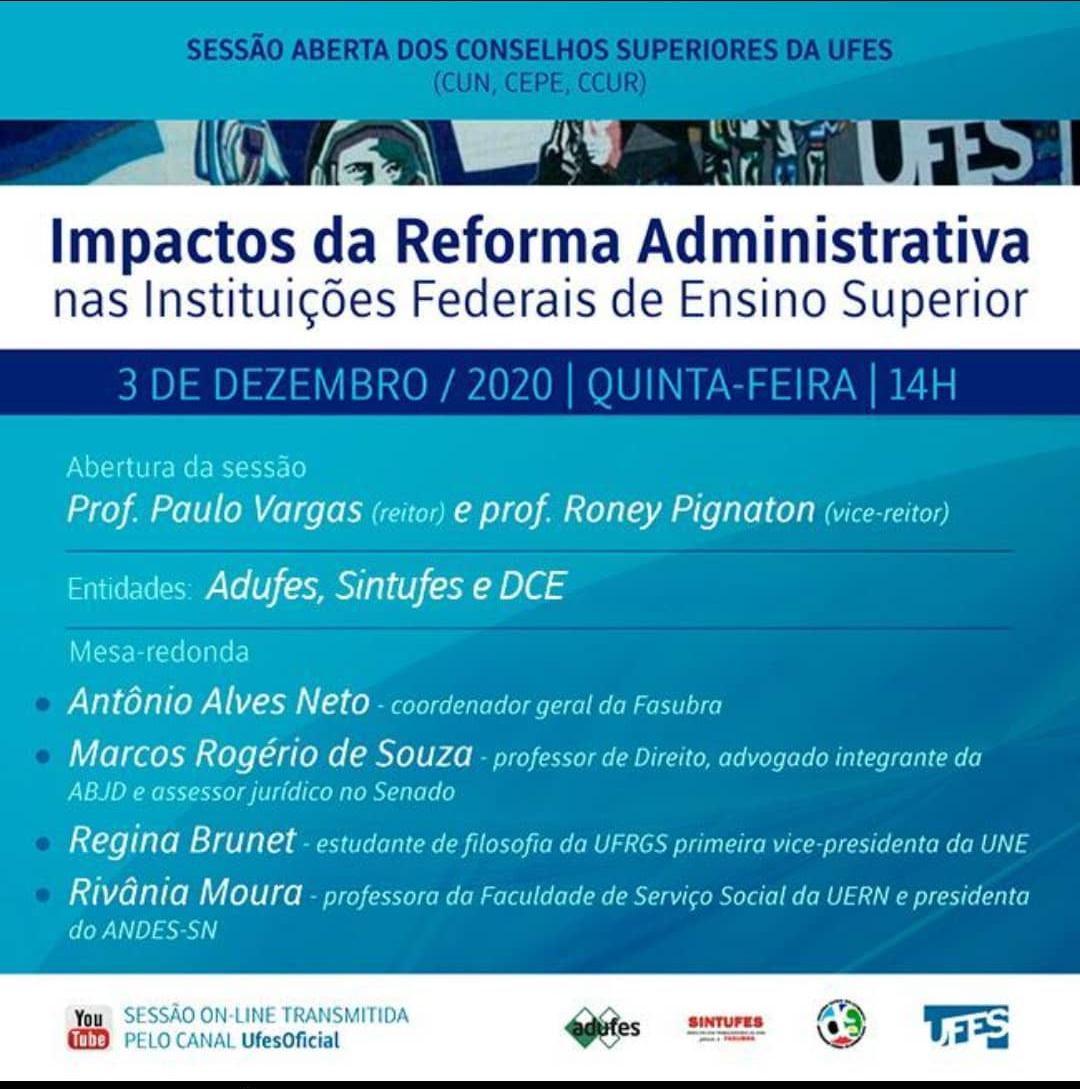 A Ufes promove nesta quinta-feira, 3, uma sessão aberta dos Conselhos Superiores para debater os Impactos da Reforma Administrativa nas Instituições Federais de Ensino Superior. O evento on-line será transmitido pelo canal UfesOficial no Youtube.