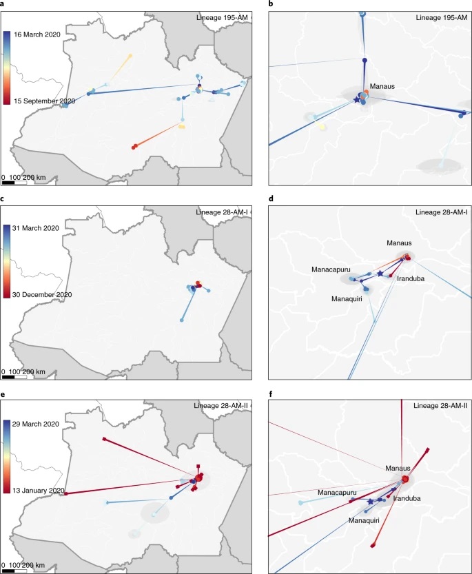 Imagem mostra a disseminação espacial dos principais grupos amazônicos do SARS-CoV-2.