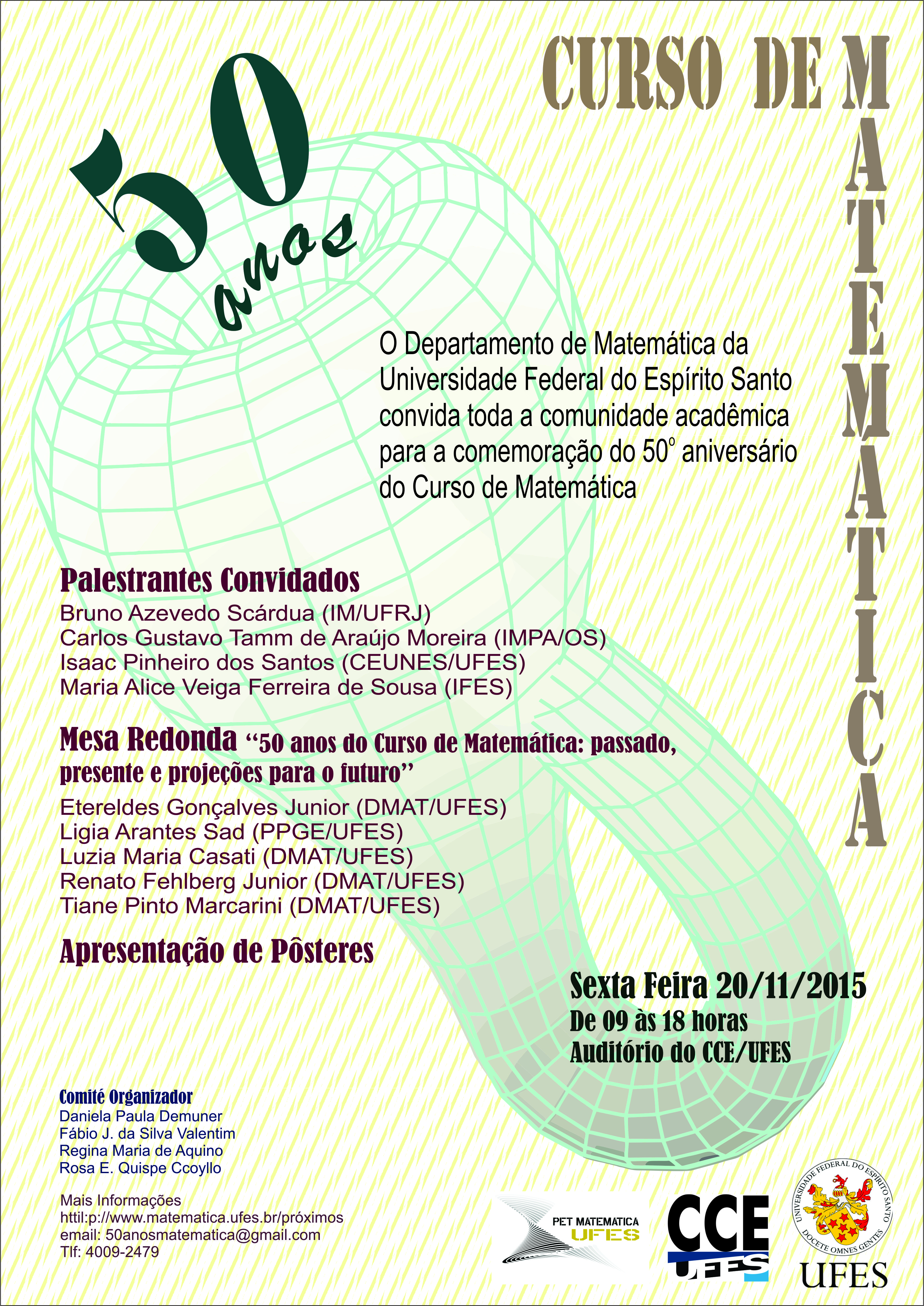 O Departamento de Matemática realiza nesta sexta-feira, 20, um evento em comemoração aos 50 anos de criação do curso de Matemática na Ufes. Para celebrar a data serão realizadas palestras e uma mesa de discussão sobre a trajetória do curso. A proposta é fazer uma retrospectiva da graduação e debater o passado, o presente e as projeções para o futuro.