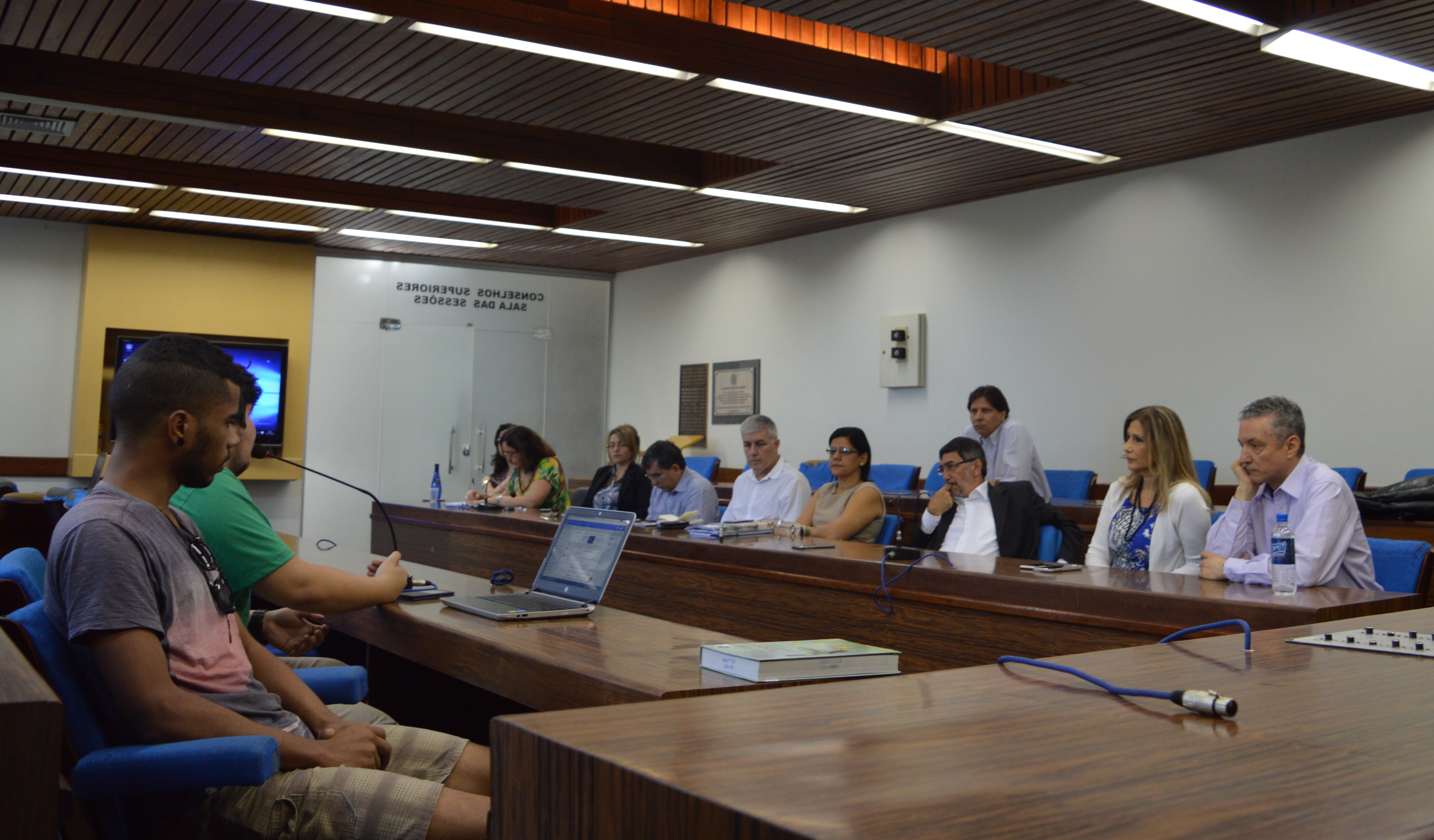 A recém-eleita diretoria do Diretório Central dos Estudantes (DCE) solicitou reunião ao Gabinete do Reitor para apresentar à administração da Universidade seus novos membros e propostas de gestão para o mandato 2016/2017. O encontro foi realizado na Sala dos Conselhos na manhã desta quarta-feira, 13, e contou a presença do reitor Reinaldo Centoducatte, da vice-reitora Ethel Maciel, de pró-reitores e de dirigentes da Ufes.