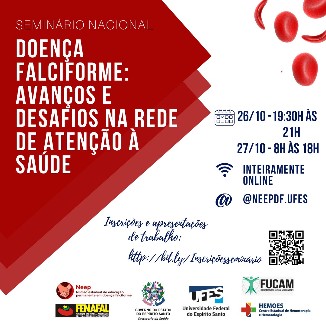 O evento será realizado na modalidade on-line, e as inscrições para submissão de trabalhos podem ser feitas até 15 de outubro. Para quem vai participar como ouvinte, as inscrições vão até 25 de outubro. Mais informações estão disponíveis no perfil do Núcleo Estadual de Educação Permanente em Doença Falciforme/Ufes no Instagram (clique aqui para acessar).