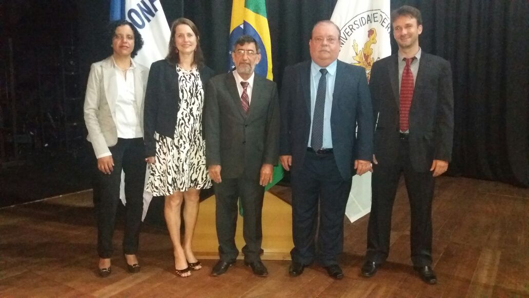 Na foto: A vice-diretora Simone Anastácio e a diretora Neuza Costa (CCENS), o reitor Reinaldo Centoducate, o diretor Dirceu Pratissoli e o vice-diretor Henrique Dias (CCAE).