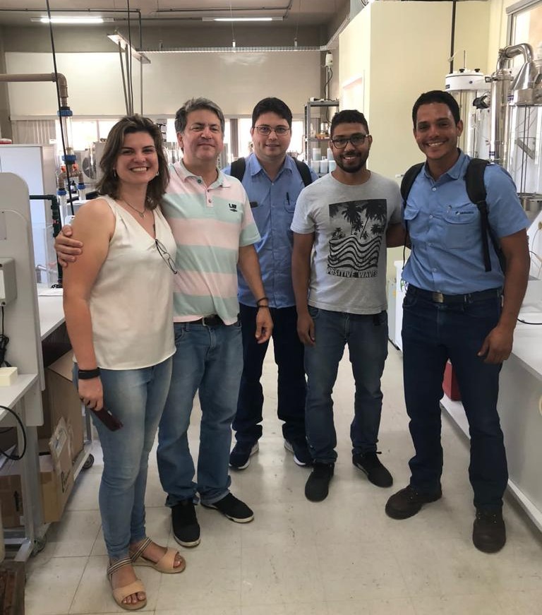 Os engenheiros da Samarco Mineração Raphael Medeiros e Fábio Ferreira (ambos de camisa azul, na foto) visitaram na última quinta-feira, 9, o Laboratório de Fenômenos de Transporte e Operações Unitárias do curso de Engenharia Química do campus de Alegre. Eles foram conhecer os estudos desenvolvidos pela Ufes que envolvem gestão de rejeitos a partir do uso de jardins filtrantes, além de tratamento e aplicação de biomassas lignocelulósicas, estruturadas basicamente por três polímeros: celulose, hemicelulose e lignina.