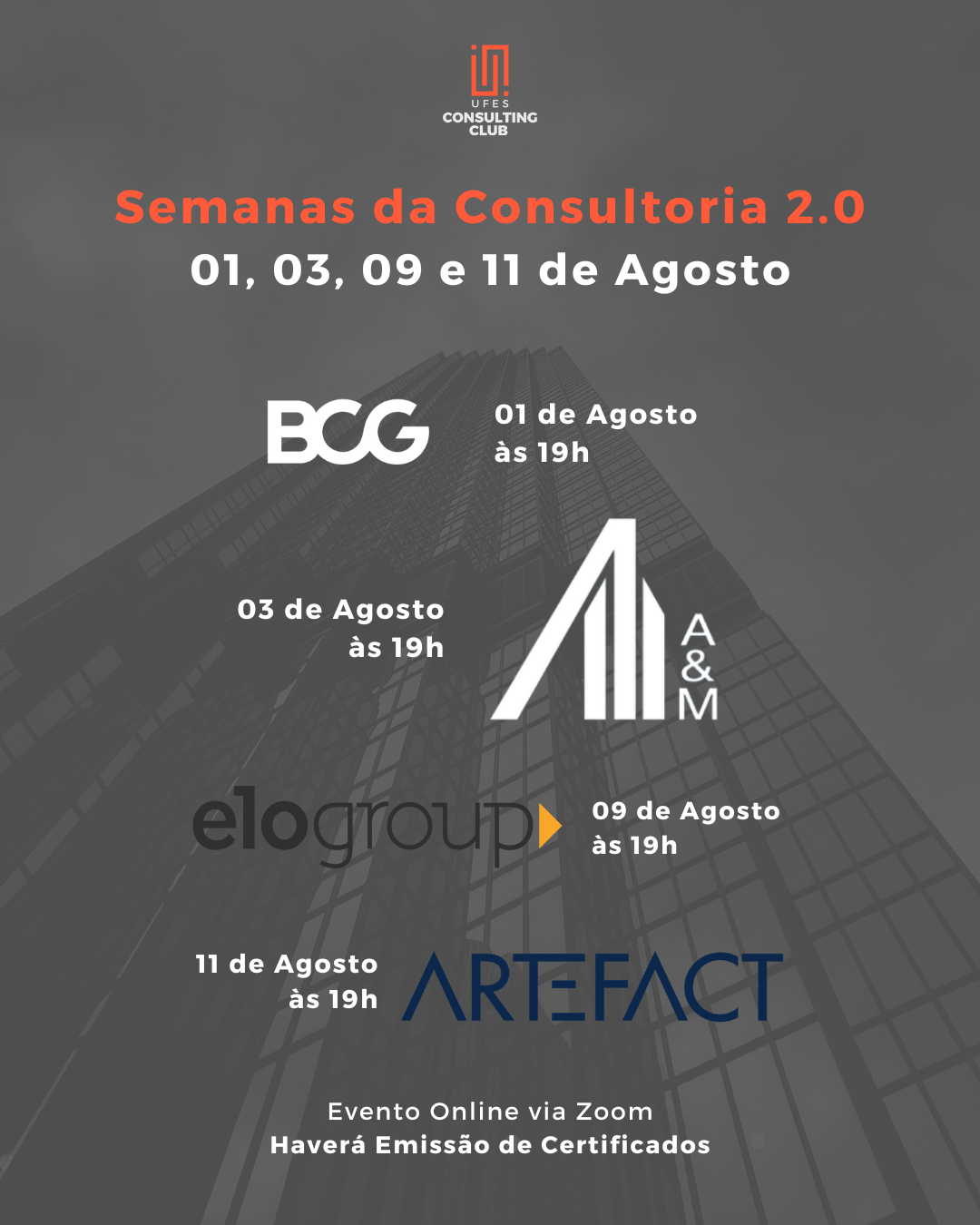 Estudantes da Ufes podem participar a partir desta segunda-feira, 1º, do primeiro evento das Semanas da Consultoria 2.0, promovido pelo Ufes Consulting Club, formado por alunos da Universidade. O evento contará com a presença de diversas empresas globais de consultoria estratégica, que compartilharão suas experiências diárias no trabalho, assim como outros projetos feitos pelos próprios consultores.