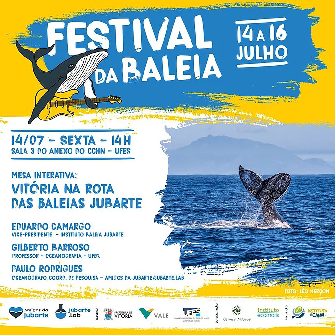 Com o tema "As Jubartes na rota de Vitória". A mesa contará com a participação do oceanógrafo e coordenador de pesquisa do projeto Amigos da Jubarte e Jubarte.lab, Paulo Rodrigues; do vice-presidente do Instituto Baleia Jubarte, Eduardo Camargo; e do professor do curso de Oceanografia da Ufes, Gilberto Barros, que tem experiência na área de conservação de ecossistemas aquáticos.
