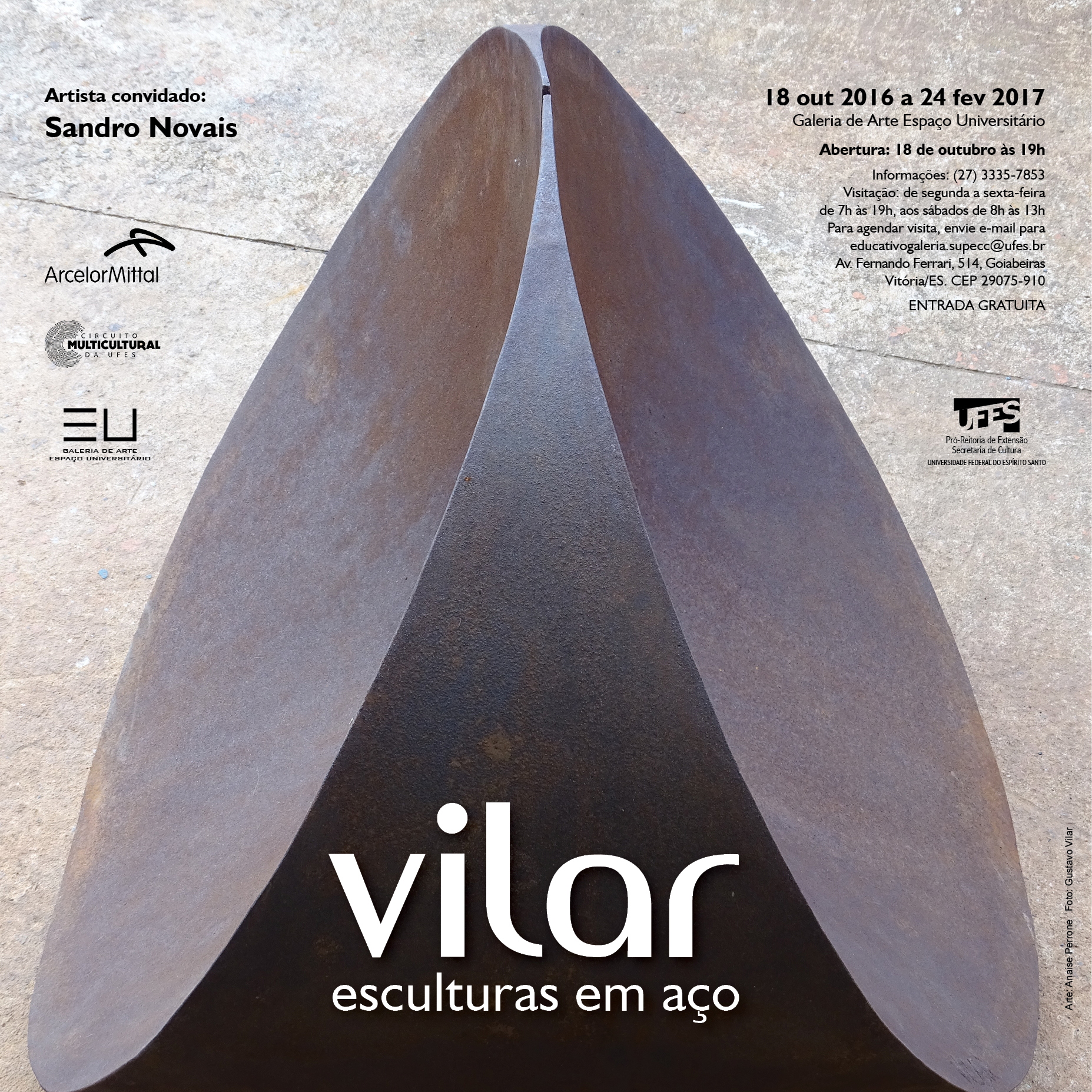 Na ocasião, será inaugurada ainda uma seção de exposições externa, denominada Coleções, com uma grande escultura inédita de Vilar. A obra, uma realização da Secretaria de Cultura da Ufes em parceria com a ArcelorMittal, ficará definitivamente na universidade.