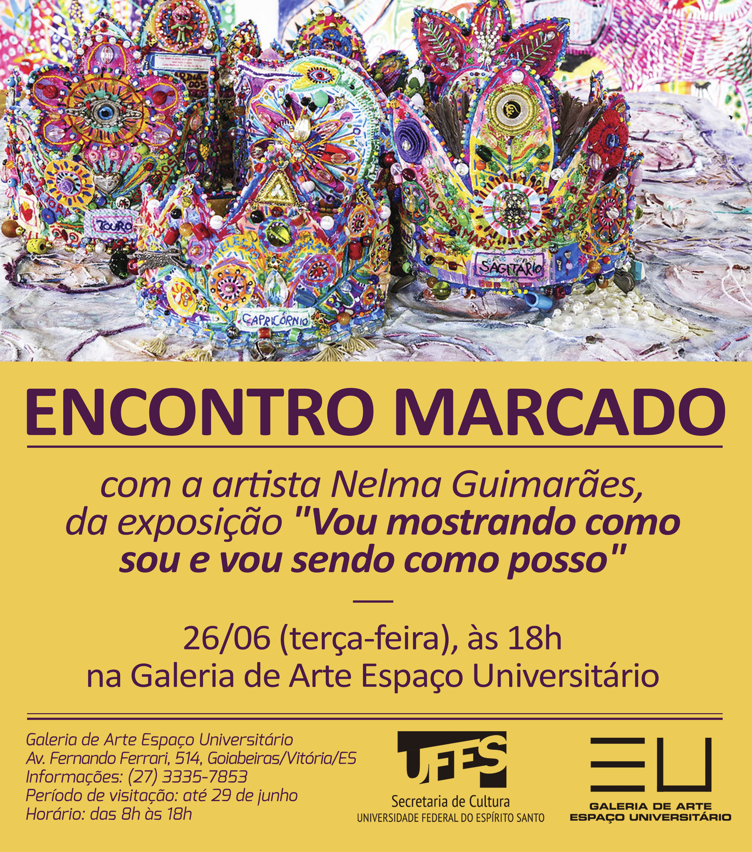 A Galeria de Arte Espaço Universitário (Gaeu), no campus de Goiabeiras, recebe na terça-feira, 26, às 18 horas, a visita da artista plástica capixaba Nelma Guimarães. Ela fará um bate papo com os visitantes da exposição Vou mostrando como sou e vou sendo como posso... em exibição na Galeria