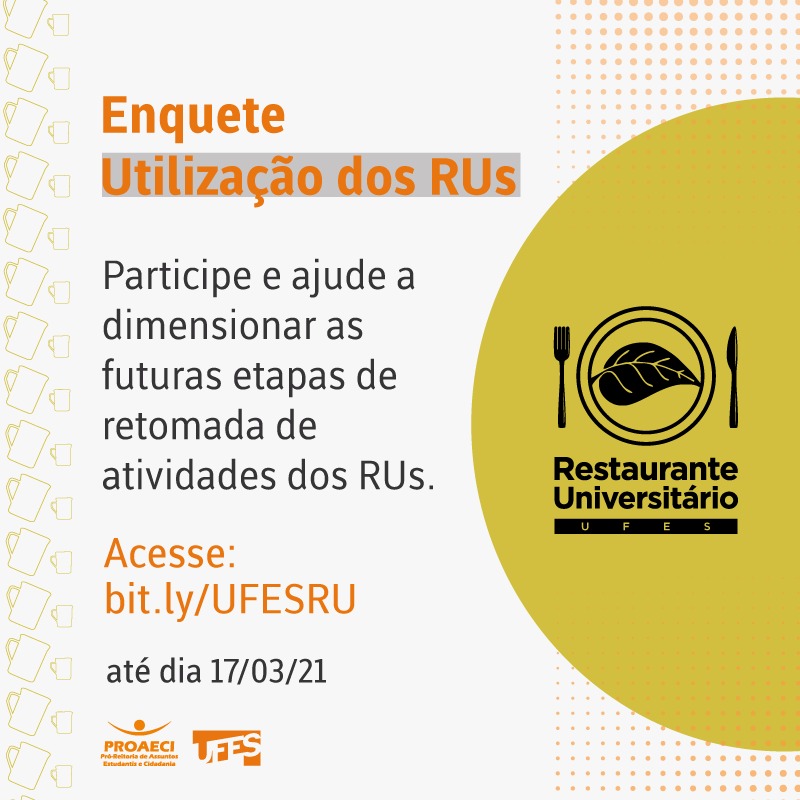 A Pró-Reitoria de Assuntos Estudantis e Cidadania (Proaeci), por meio da Diretoria de Gestão de Restaurantes (DGR), realiza a partir desta quinta-feira, 11, uma pesquisa para estimar o interesse dos estudantes em um eventual retorno dos serviços prestados pelos Restaurantes Universitários (RUs) da Ufes.