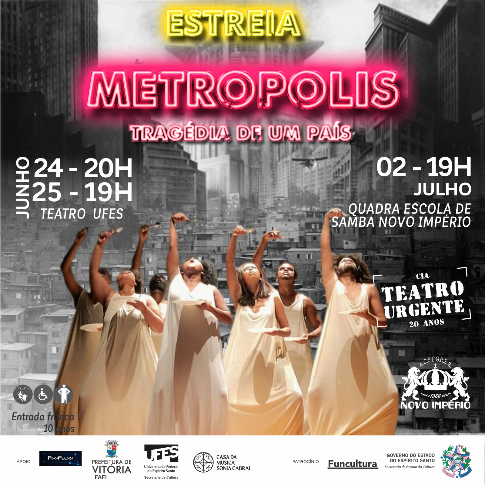 Uma apresentação especial de Metropolis acontece no dia 2 de julho, às 19 horas, na quadra da escola de samba Novo Império, em Caratoíra, Vitória.