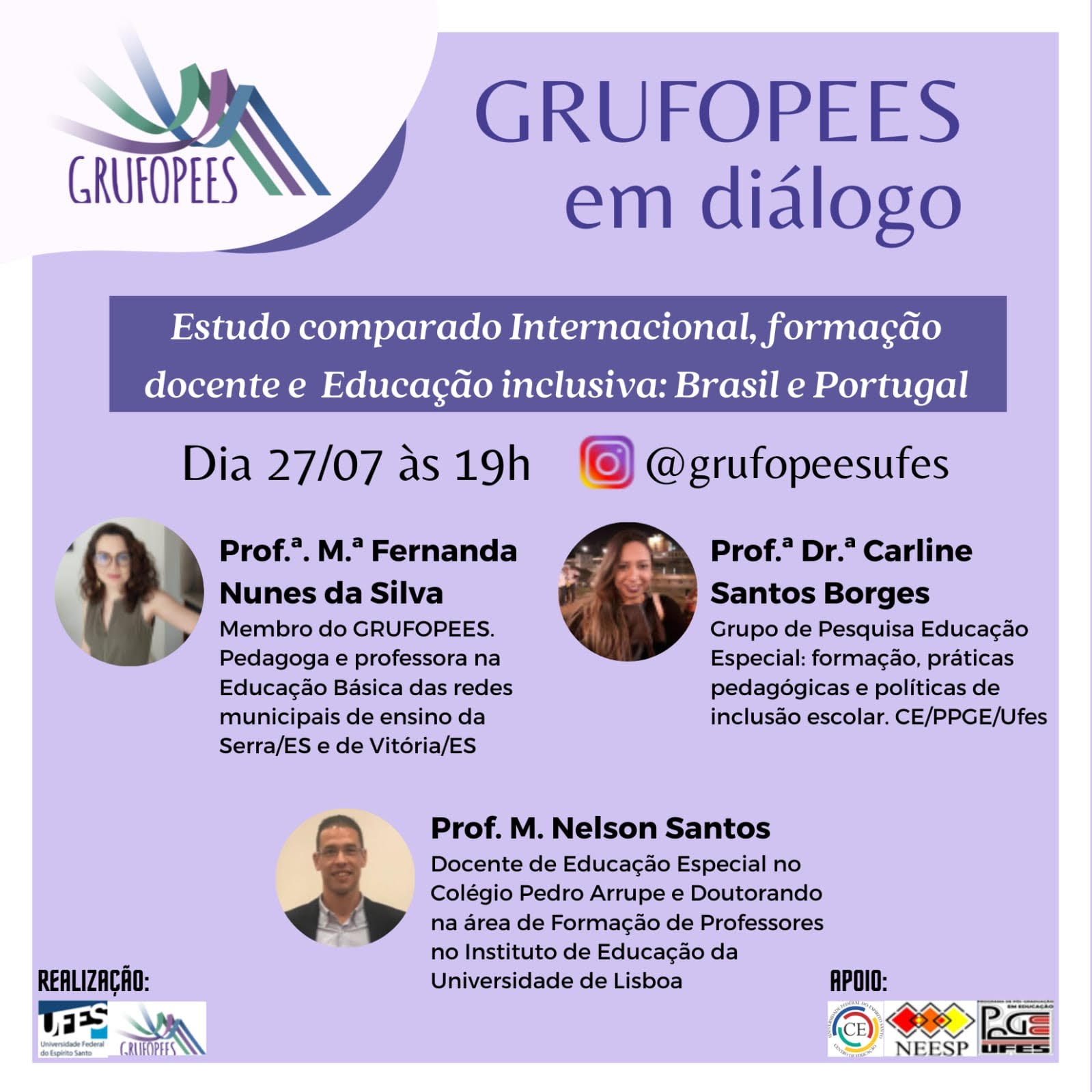 Para abordar o tema nesta quarta-feira, 27, foram convidados os professores Carline Borges, do Programa de Pós-Graduação em Educação (PPGE) da Ufes; Fernanda da Silva, que atua na educação básica nas redes municipais de Vitória e Serra; e Nelson Santos, docente em educação especial no Colégio Pedro Arrupe, em Lisboa (Portugal).