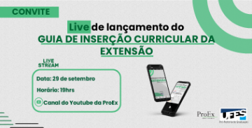 Nesta quinta-feira, 29, as pró-reitorias de Extensão (Proex) e de Graduação (Prograd) realizam o lançamento oficial do Guia de Inserção Curricular da Extensão. O evento será virtual, a partir das 19 horas, no canal do Youtube da Proex. Entre os convidados estão o reitor da Ufes, Paulo Vargas, e o vice-reitor, Roney Pignaton, além de membros das equipes das duas pró-reitorias envolvidas.