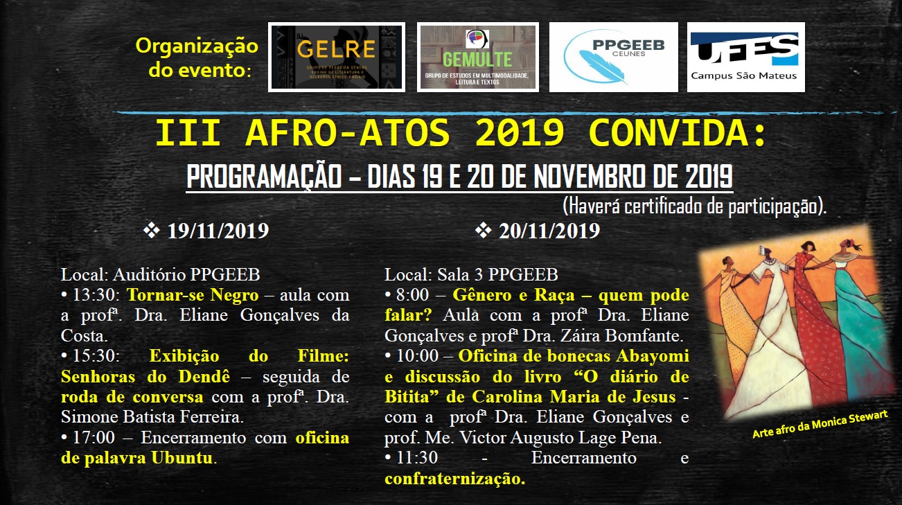 O III Afro-Atos é organizado pelo grupo de pesquisa Gênero, Ensino de Literatura e Relações Étnico-Raciais (Gelre) e pelo Grupo de Estudos em Multimodalidade, Leituras e Textos (Gemulte), ambos do PPGEEB. O evento conta ainda com participação de pesquisadores da Universidade do Estado da Bahia (Uneb) e da Universidade da Integração Internacional da Lusofonia Afro-Brasileira (Unilab-BA).
