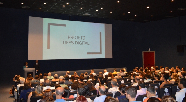 Representantes da Administração Central, gestores, técnicos-administrativos e professores participaram, na manhã dessa segunda-feira, 18, no Cine Metrópolis, da apresentação do projeto Ufes Digital, uma nova proposta de tramitação eletrônica de documentos que visa a acabar, gradativamente, com o uso de papel. Durante o lançamento, foi realizada uma apresentação técnica sobre os novos procedimentos a serem adotados e os presentes puderam dar contribuições ao projeto e tirar dúvidas sobre o seu funcionamento.