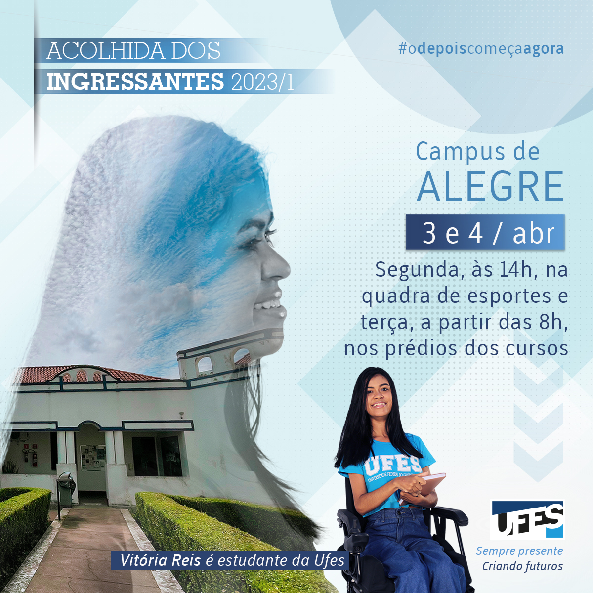 As boas-vindas aos ingressantes do semestre 2023/1 no campus de Alegre têm início na tarde desta segunda-feira, 3. A partir das 14 horas, os estudantes serão recebidos na quadra poliesportiva por autoridades da Reitoria e da Pró-Reitoria de Graduação (Prograd).
