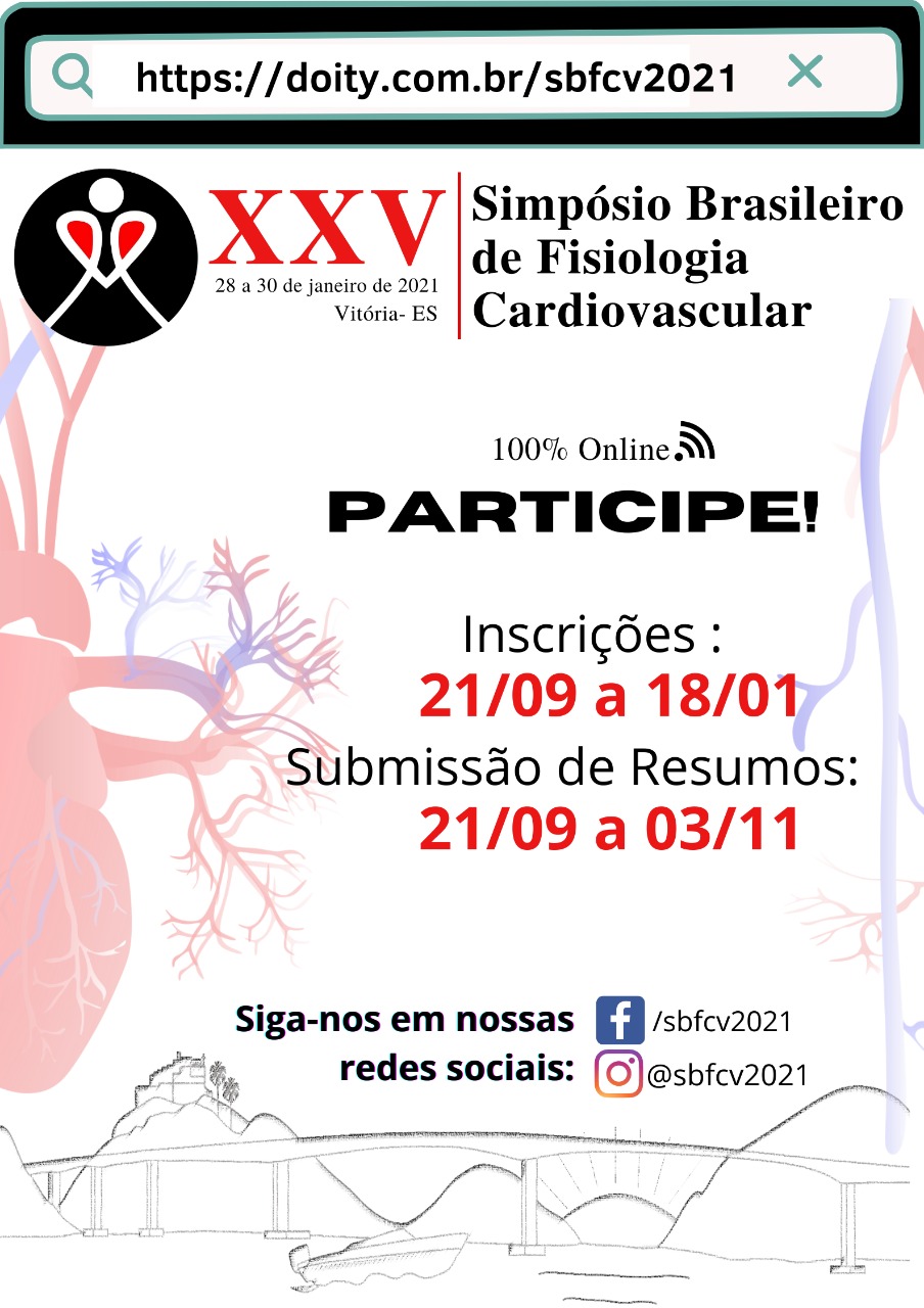 As inscrições para o 25º Simpósio Brasileiro de Fisiologia Cardiovascular (SBFCV) já estão abertas. O evento será realizado nos dias 28 a 30 de janeiro de 2021 sob a coordenação de professores da Ufes, e os interessados podem se inscrever até o dia 18 de janeiro. Entretanto, a submissão de trabalhos científicos para apresentação deve ser realizada até o dia 3 de novembro de 2020, podendo ser submetidos trabalhos relacionados com as áreas de Fisiologia e Farmacologia Cardiovascular.