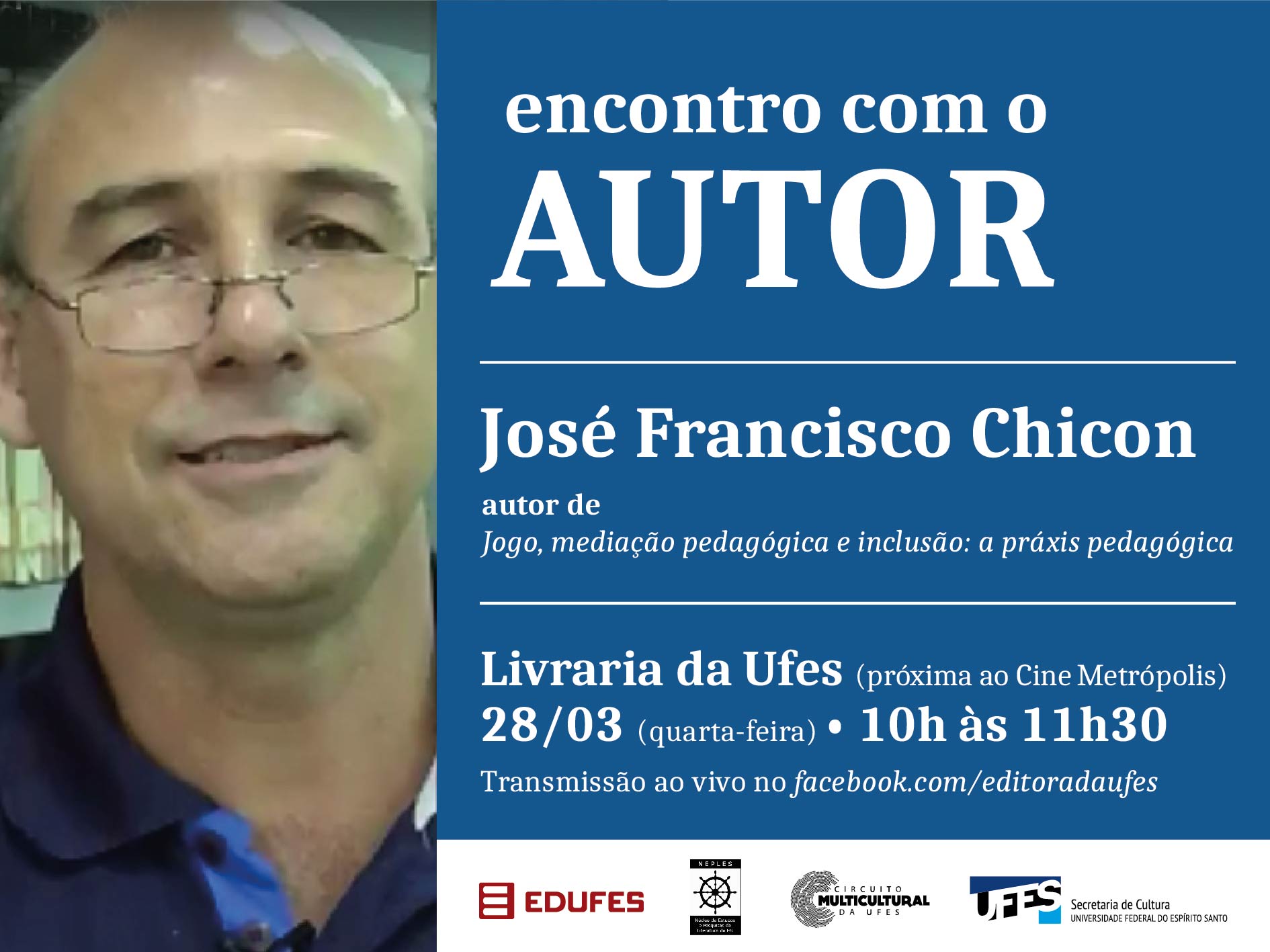 A Livraria da Ufes realiza nesta quarta-feira, 28, às 10 horas, mais uma edição do Encontro com o Autor, evento organizado pela Editora da Ufes (Edufes) com o objetivo de promover a aproximação entre autor e leitores. O encontro desta quarta será com José Francisco Chicon, autor de "Jogo, mediação pedagógica e inclusão: a práxis pedagógicas". O evento é aberto ao público.