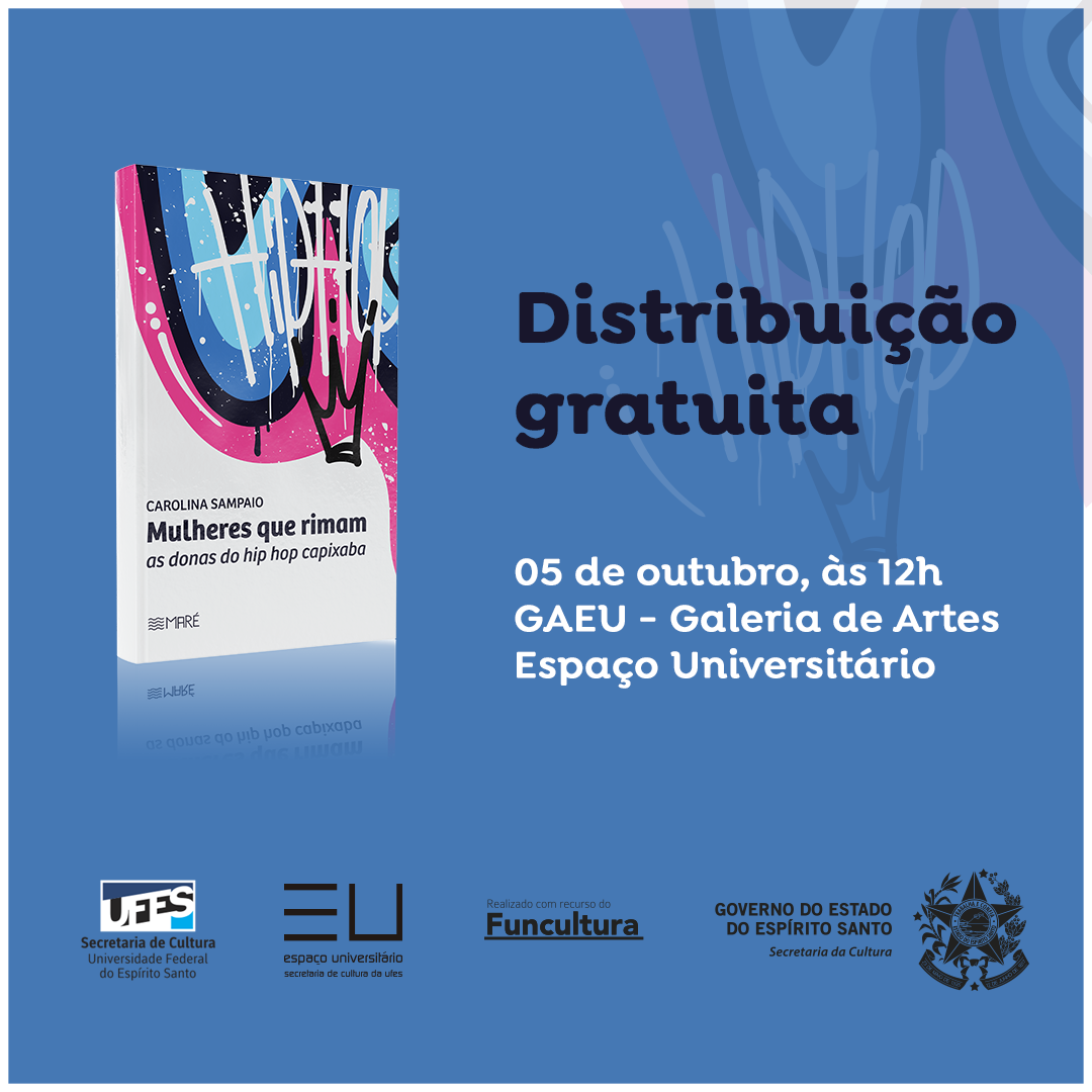 A Galeria de Arte Espaço Universitário (Gaeu), localizada no campus de Goiabeiras, recebe nesta quarta-feira, 5, o lançamento do livro Mulheres que Rimam, produzido por Carolina Sampaio, mestre em Comunicação e Territorialidade. O lançamento será às 12 horas e o livro terá distribuição gratuita no local.