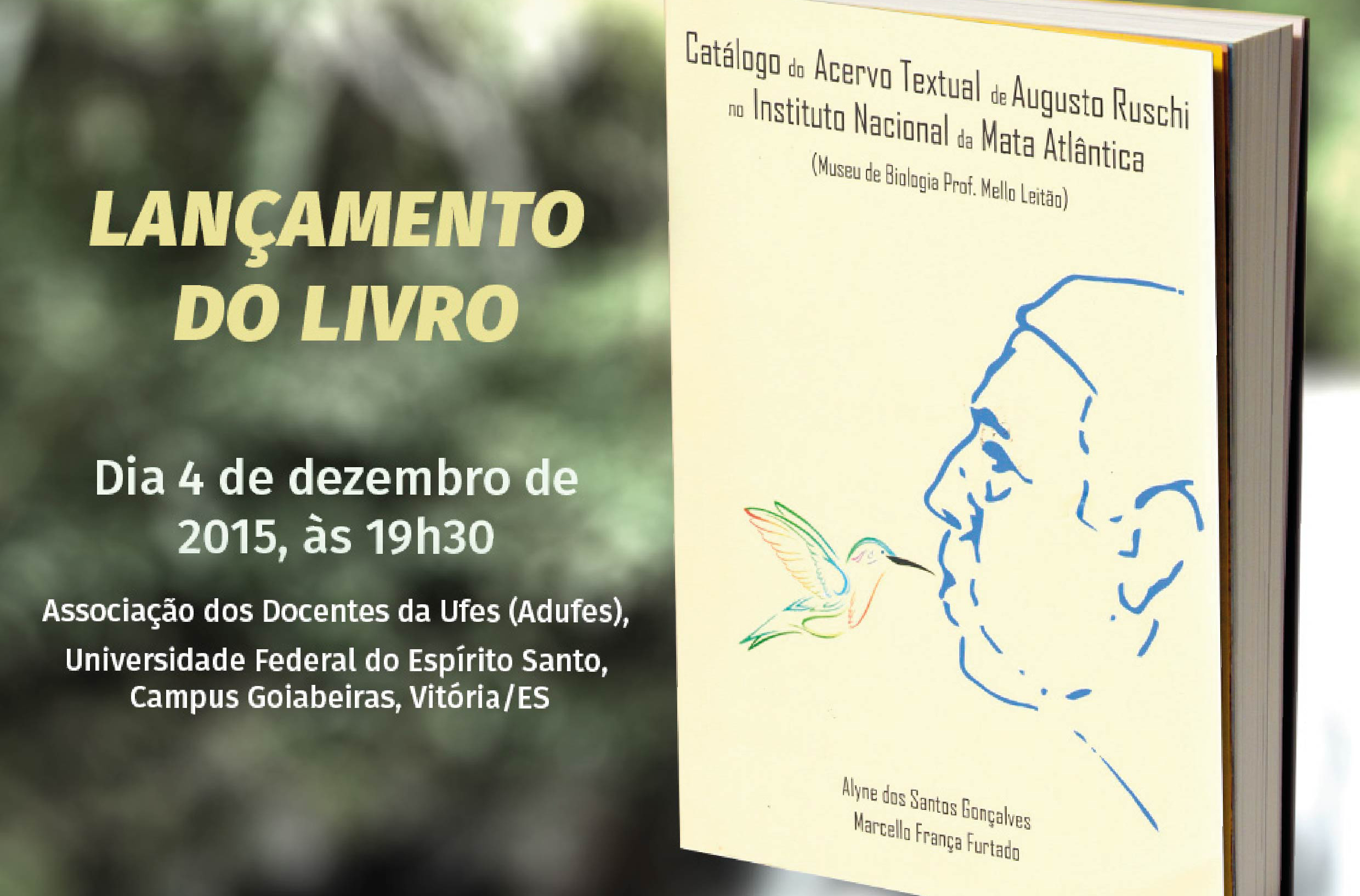 O “Catálogo do acervo textual de Augusto Ruschi no Instituto Nacional da Mata Atlântica” será lançado nesta sexta-feira, dia 4, às 19h30, na sede da Associação dos Docentes (Adufes), no campus de Goiabeiras, Vitória. O lançamento será feito pelos autores, a doutoranda Alyne dos Santos Gonçalves e o mestrando Marcello França Furtado, do Programa de Pós-Graduação em História. O evento faz parte das comemorações organizadas pela Ufes pelo centenário de nascimento – completado este ano – do cientista, professor, biólogo e ambientalista Augusto Ruschi.